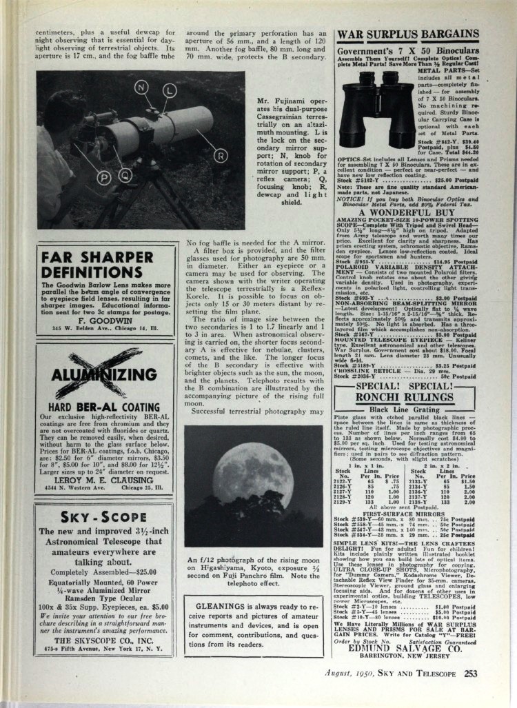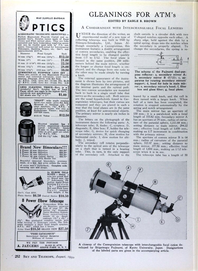 garakuma.gif  ぼ〜っとSky&Telescopeの古い記事を眺めていたら、1950(昭和25)年に藤波式の望遠鏡と言うか、望遠レンズが掲載されておりました。天体観測ができるような経緯台に乗って、焦点距離が変わるとのことで、アイデアとしてはこちらの方が先かもしれません。