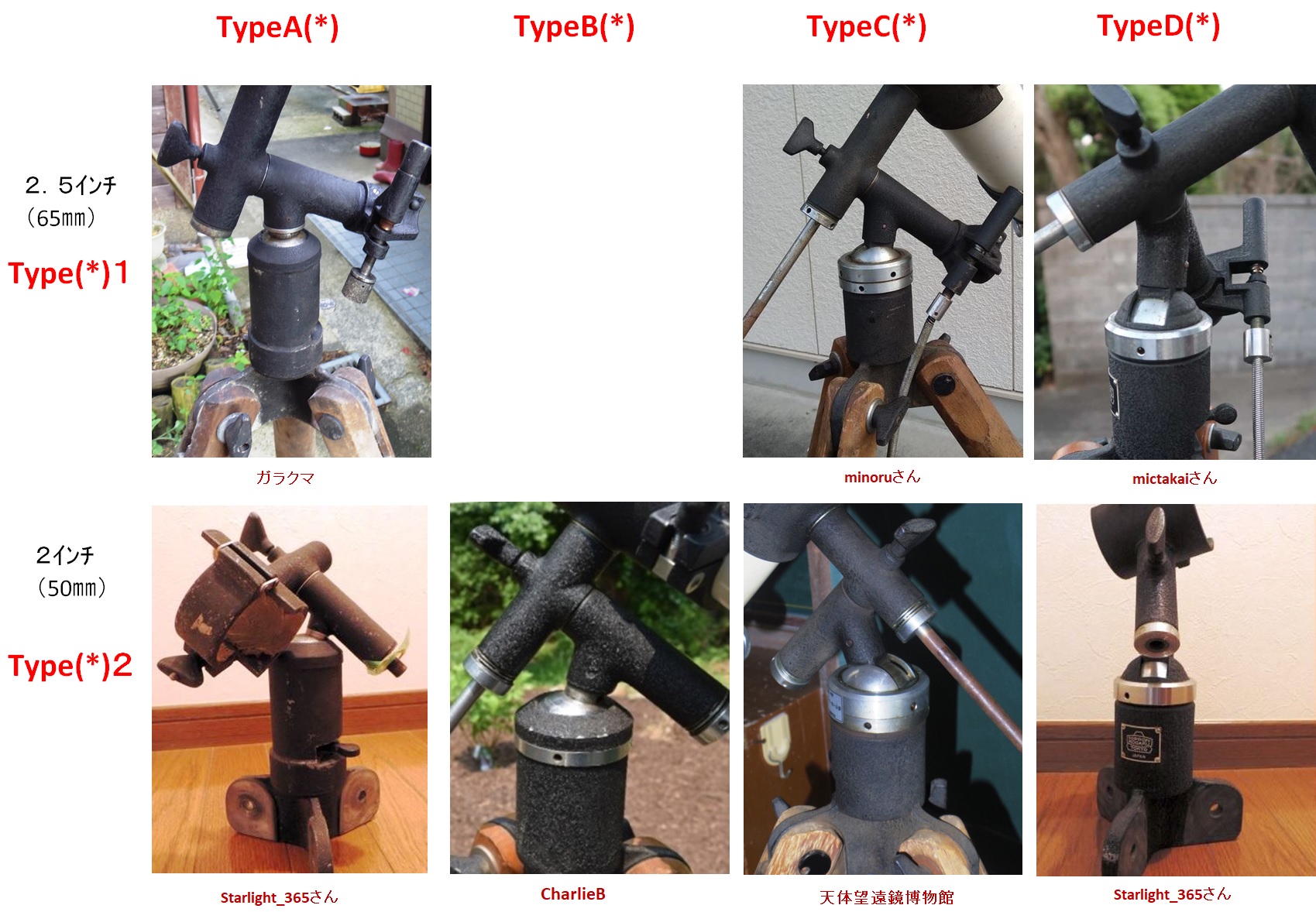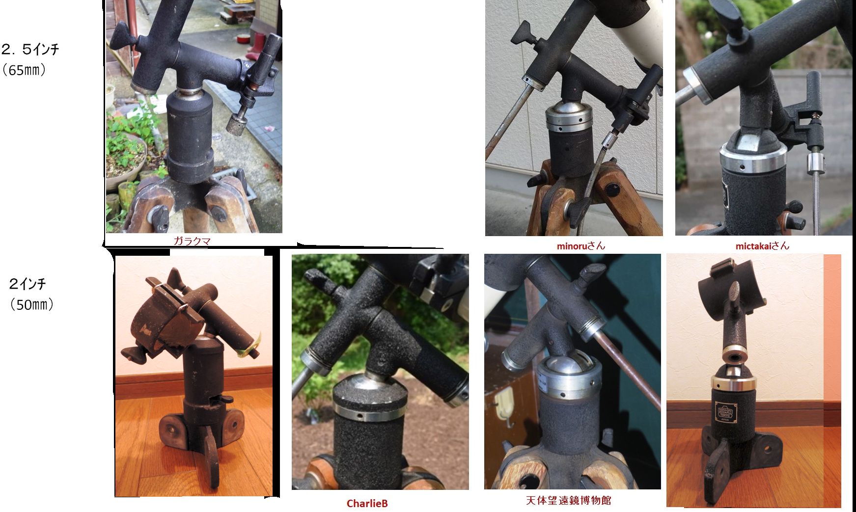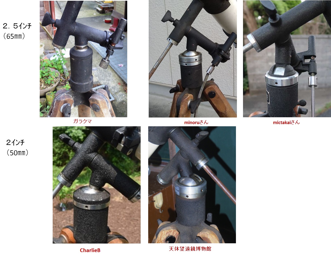 写真1、2枚目は私が手に入れた物。3枚目は博物館の所有の2.5インチ(故本田実氏使用)、4枚目は2インチ、5枚目は五藤光学エロス号