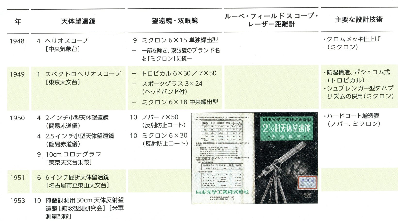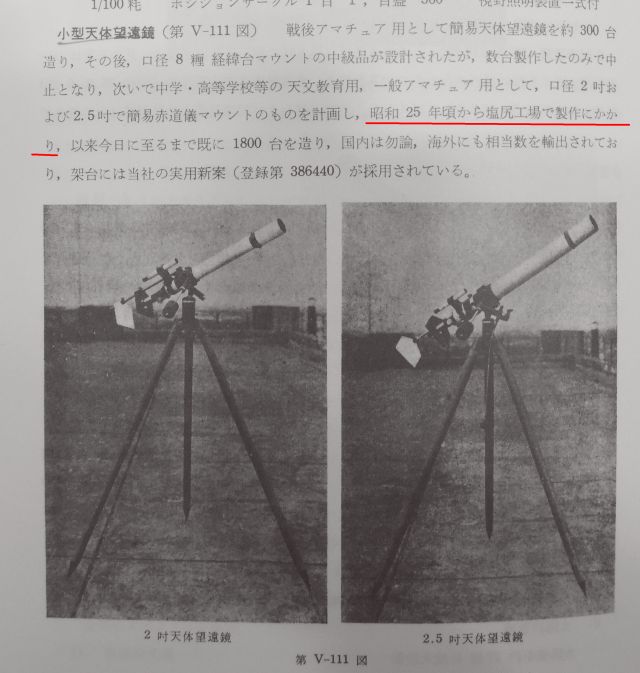 「1946(昭和21)年から1950(昭和25)年にかけて、アマチュア及び教育用として簡易赤道儀架台付の5cm、6.5pの屈折望遠鏡が相当数製作されたが・・・」