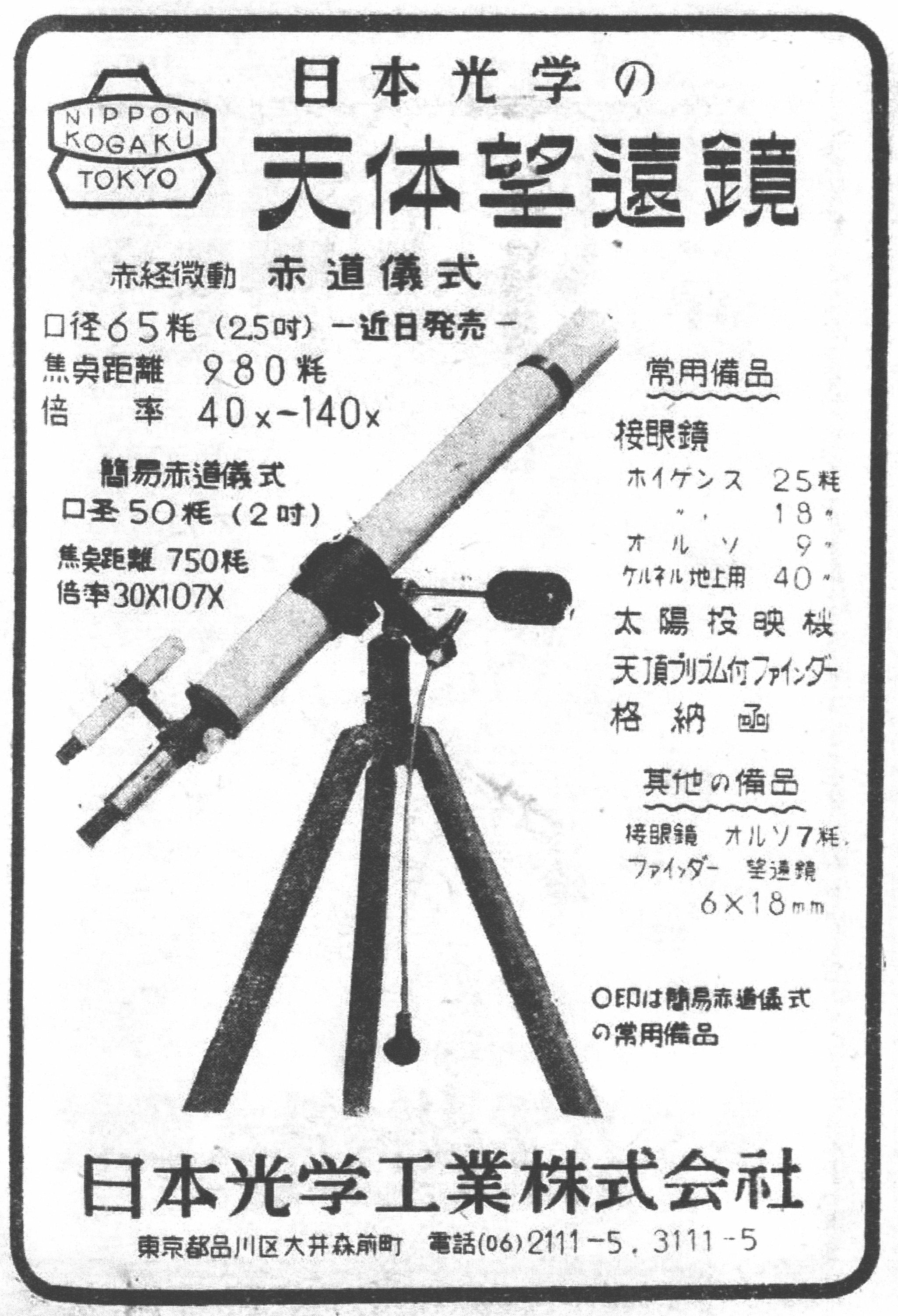 なお、手元の雑誌広告では2吋屈折式簡易赤道儀は1950年秋頃、2.5吋屈折式赤経微動