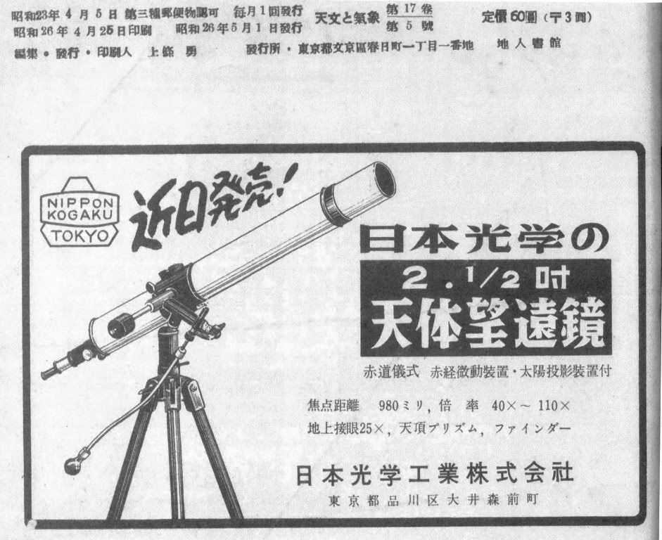 Nikonの社史、教材教具の1951年3月号の広告、天文と気象の1951年5月号の広告。並べますが、矛盾あります。