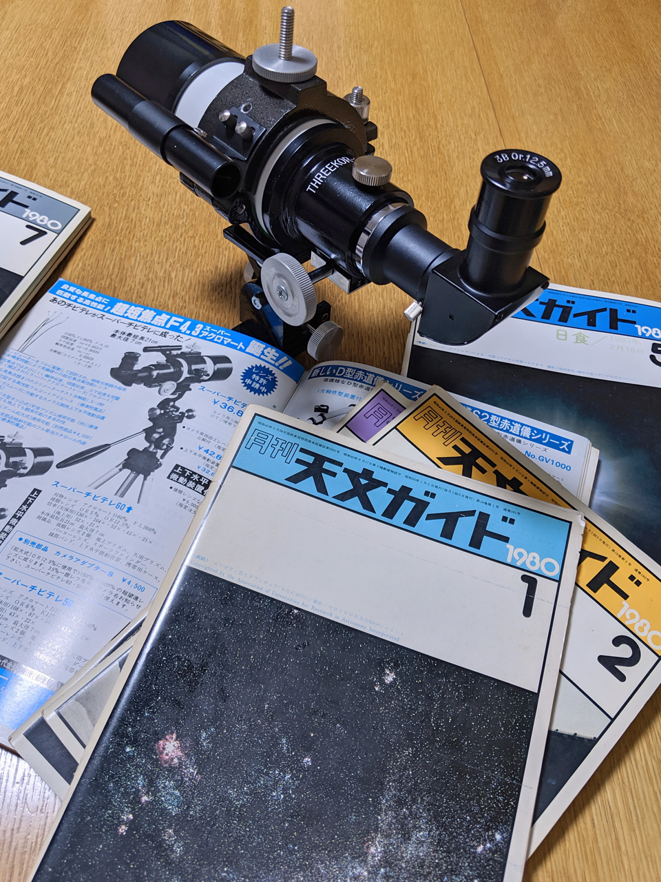 1980年ごろ中学生だった私が欲しかった天体望遠鏡の一つでしたが、結局手に入れることはできないまま約40年、ずっと心の片隅にあり、こちらのサイトの展示室の写真や資料室のカタログなどを眺めながら思いを募らせていたところ、オークションで程度のよさそうなものを発見、無事落札して実物を手にしたときは感慨ひとしおでした。