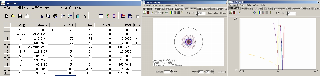 十数年前に読んだ論文の設計例をアレンジしたものですが、BK7-F2を5枚用いて70mmF9でエアリーディスク内にg線までほぼ収まっています。(コマは補正されてませんし、倍率の色収差も駄目です。惑星スペシャルですな)
