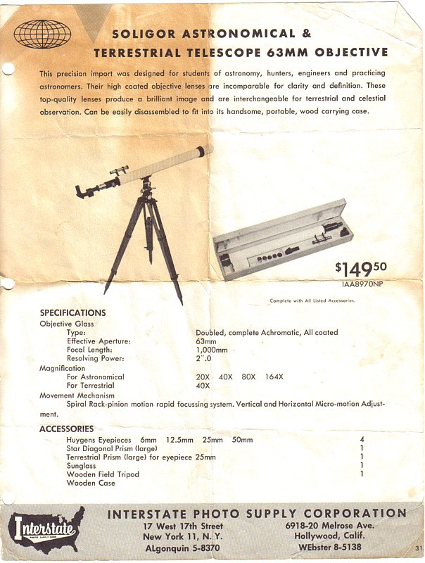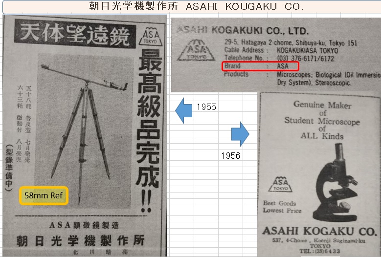 CharlieB、こんばんわ。 みなさま、こんばんわ。 朝日光学機製作所は、顕微鏡メーカーとして有名な会社です。 「光学産業名鑑 1965年度版」では、1946年設立と記されています。 現在も健在です。ブランド名がASAです。 1955年には、天体望遠鏡を製造しています。 58mm屈折と63mm屈折の2種類があったようです。 63mm屈折が微動装置付きです。 Soligor だけでは、私も、どこのメーカーなのかわかりませんでしたが、 ASAで、その素性がはっきりしました。 CharlieBさまが、提供してくれる情報は、とても貴重です。 日本国内には、1950年代に輸出された天体望遠鏡がほとんど残っていません。 そのため、調査にも限界があります。 これからも、情報を提供してください。