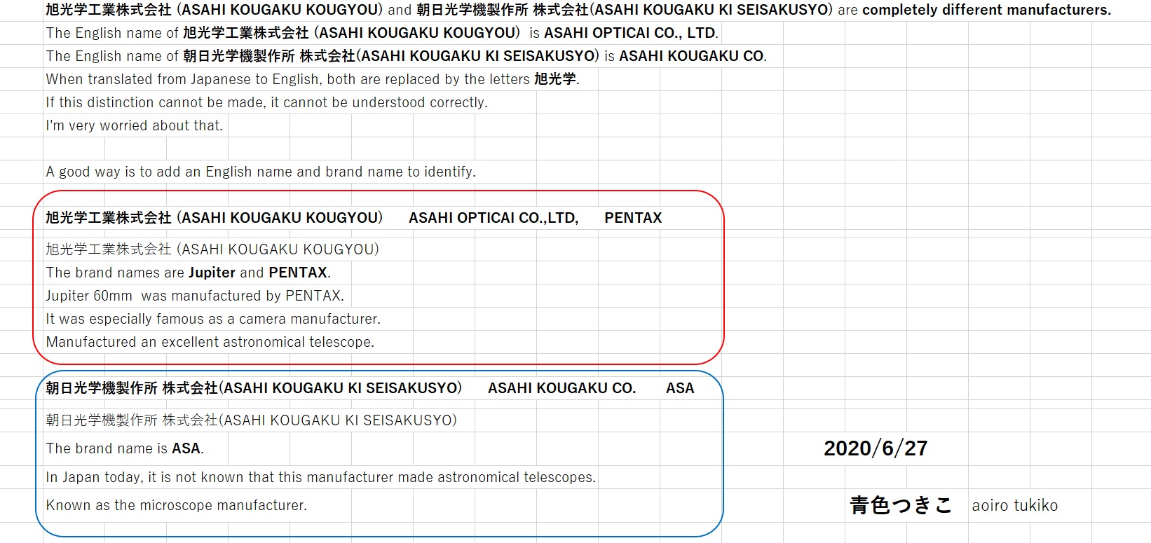 Charlie B、こんにちわ。 みなさん、こんにちわ。 Charlie B、とても心配なことがあります。 旭光学工業株式会社(ASAHI KOUGAKU KOUGYOU)と朝日光学機製作所株式会社(ASAHI KOUGAKU KI SEISAKUSYO)は、全く別なメーカーです。 旭光学工業株式会社(ASAHI KOUGAKU KOUGYOU)の英語名はASAHI OPTICAI CO.,LTDです。 朝日光学機製作所株式会社(ASAHI KOUGAKU KI SEISAKUSYO)の英語名はASAHI KOUGAKU CO.です。 日本語から英語に翻訳すると、どちらも旭光学という文字に置き換えられてしまいます。 この区別ができないと、正しく理解することができません。 私は、それがとても心配です。 英語名とブランド名を付け加えて識別する方法が良いです。 旭光学工業株式会社、ASAHI OPTICAI CO.,LTD、PENTAX 旭光学工業株式会社(ASAHI KOUGAKU KOUGYOU) ブランド名はJupiterとPENTAXです。 Jupiter 60mm を製造したのは、PENTAXです。 カメラメーカーとして特に有名でした。 優秀な天体望遠鏡を製造していました。 朝日光学機製作所株式会社、ASAHI KOUGAKU CO.、 ASA 朝日光学機製作所株式会社(ASAHI KOUGAKU KI SEISAKUSYO) ブランド名はASAです。 現在の日本では、このメーカーが天体望遠鏡を作っていたことは知られていません。 顕微鏡メーカーとして知られています。 Charlie B、教えていただきたいことがあります。 Swift 831,838,839は、いつ頃まで製造されていたのでしょうか。