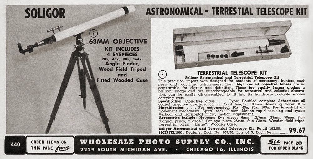 私も、この望遠鏡については、分かりません。 ちょっと検索してみますと、お恥ずかしながらミランダ研究会さんをはじめて知りました。http://miranda.s32.xrea.com/miranda/index.html 私のとっては、ソリゴールといえばミランダのカメラレンズ。ミランダのカメラはミラーボックスが薄く、どこのレンズでも取り付けることができて、魅力でした。 ただ、ソリゴールレンズは玉石混交、少し怪しいものもあったように思いますし、ヤシカとか、ミランダ用だけではなかったように思います。 ミランダの創業者は天文マニアであったらしく、戦後早い時期は望遠鏡販売でも有名であった銀座の松島屋眼鏡店が売っていたようです。 だいたいソリゴールは、特定の業者が作っていなかったらしいので、メーカーは分かりませんが、松島屋眼鏡店が企画した製品かもしれませんね。 まったく、想像でしかありませんが。
