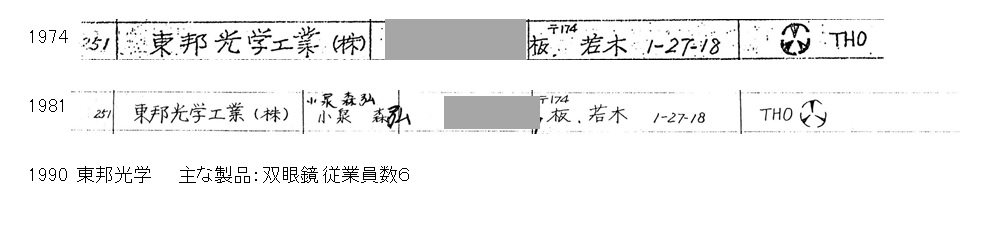 東邦光学工業の場所はガラクマさん示されたように板橋区若木1−27−18ですが、 昭和57年刊の「板橋工業50年のあゆみ」によると、 従業員数5人以下となっています。 また鰹汪ヤ光学機械は若木1−27−17です。これ完全にお隣さんです。 隣に同業者がいてもビジネス上でまったくお付合いがなかったりするのが 板橋区光学産業の摩訶不思議なところだったりします。 |
