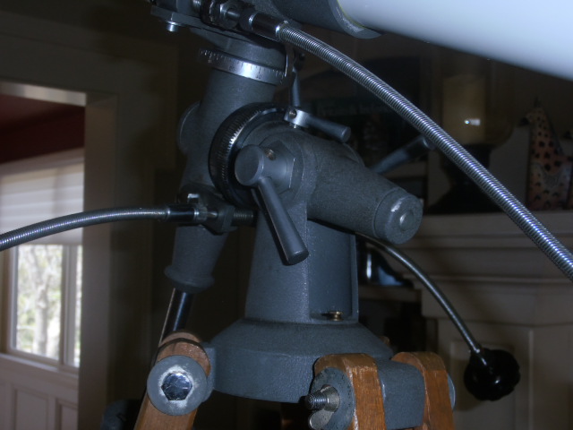 S-5型のようなマウントとの比較ですが、 このように極軸体から下に舌状金具が出ているタイプでは、 不動点高が高くなるので、鏡筒が三脚に当たりにくく、 死角が少なくなる利点があります。 下左の物はハーフピラーが付いていますね。これならさらに特長が生かせます。 このハーフピラーはオーナーによる改造でしょうか?それとも最初からこの形?
