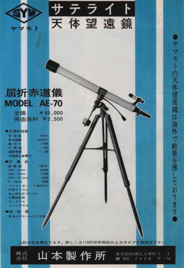 このSYWというのは山本製作所です。 輸出専業業者だったらしいですが、これは1973年の広告で国内販売をしています。 しかし国内での販売数は少なく、我々もなかなか入手できません。 雑誌のテスト記事では対物レンズの優秀性が高く評価されていました。 高橋製作所の近所にあった会社ですが、デザインはアストロ光学に似ています。