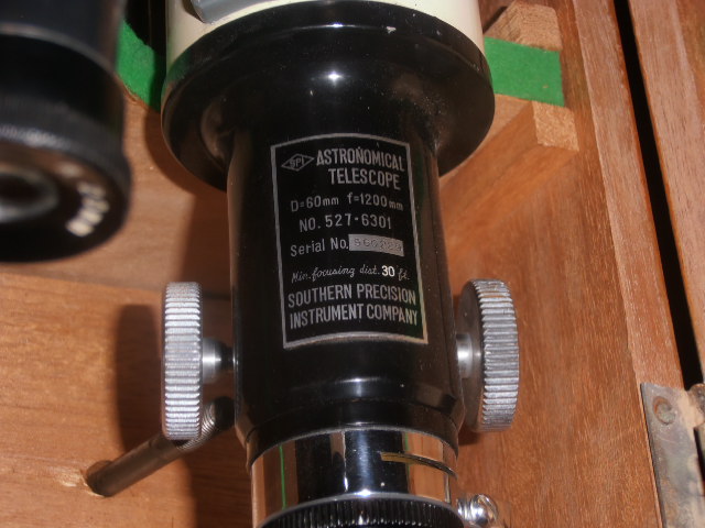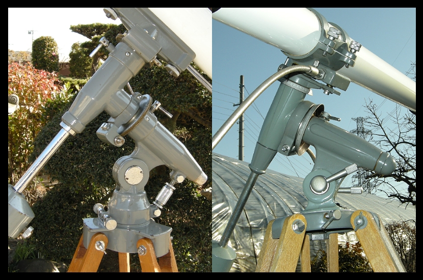 Stew様 ありがとうございます。 ↑の望遠鏡は日本国内仕様とは相違点が多いです。 1)赤緯微動が横方向に出ている。 2)ファインダーが鏡筒部に付いている。 私の想像では、これはごく初期の古いタイプではないかと思います。 たぶん1958から1960年。