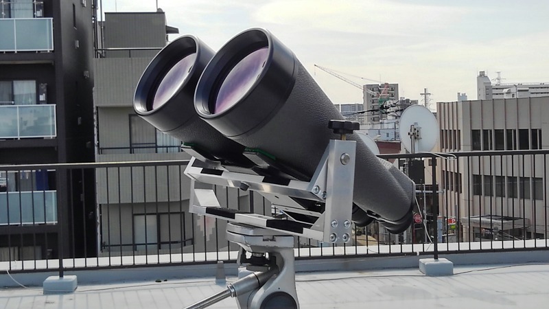 下から支えている双眼鏡ホルダーは自作品でしょうか?溶接構造の随分しっかりしたものとお見受けしました。