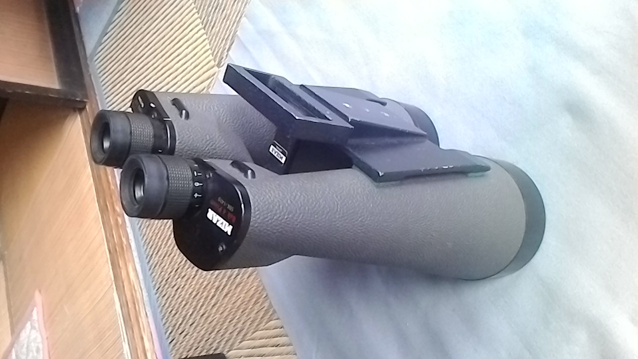 ようやく参加可能レベルのスレになりました。ありますよ、確か1万円くらいで落札した覚えがあります。台座はミザールオリジナルではないかな。目幅も変えられます。私はもう少し倍率が高くてもよいかな、16〜18倍位。100mm口径がモッタナイような。80mmと比べると迫力満点。