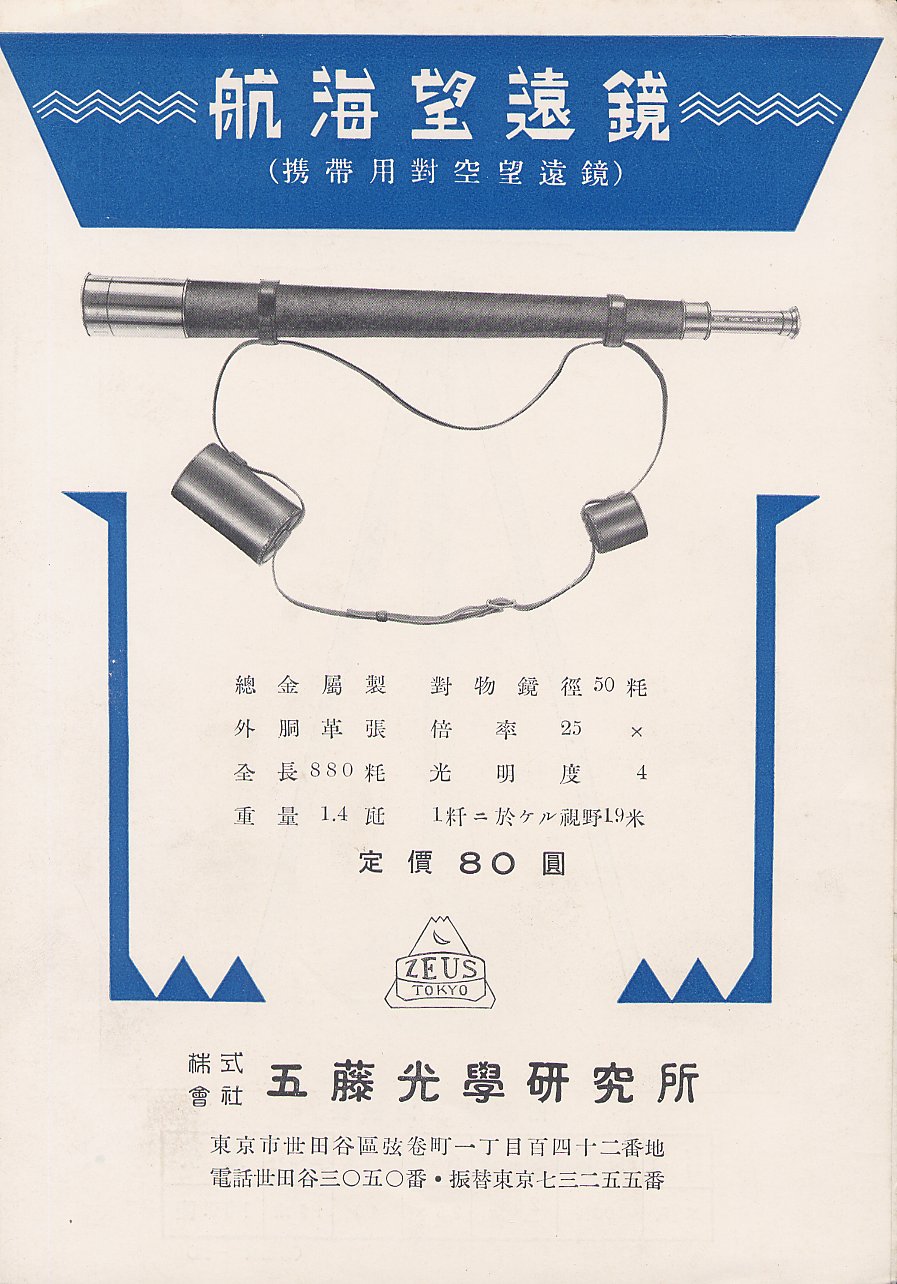 Zeusの広告で説明されている航海望遠鏡は、第二次世界大戦前のものです。 五藤光学は1938年(昭和13)から1941年(昭和16)までの株式会社でした。 ロゴはゼウスです。 接眼レンズ管のマーキングは五藤光学製作所ではなく、ゼウスだと思います。 航海望遠鏡は、同社の長年の製品です。