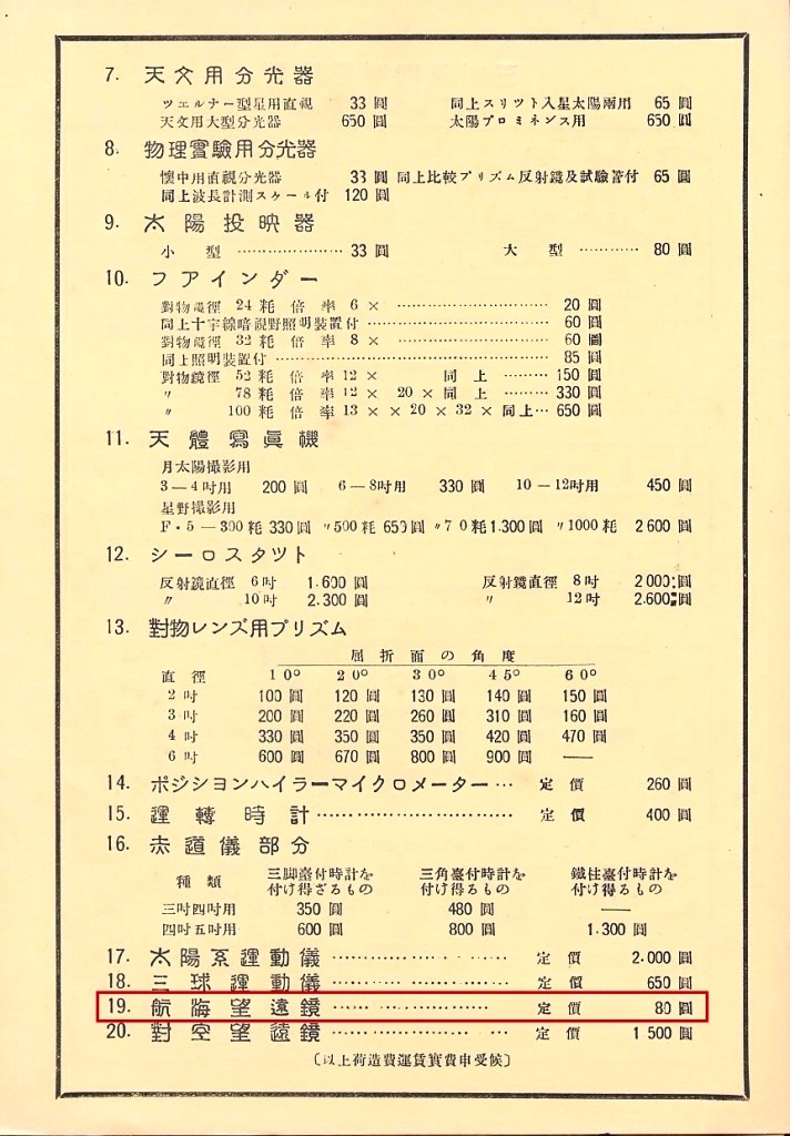 口径40o架台付、地上用接眼レンズ付きのコメット号が70円、47oのアポロン号が130円ですので、航海望遠鏡の80円は高いですね〜。