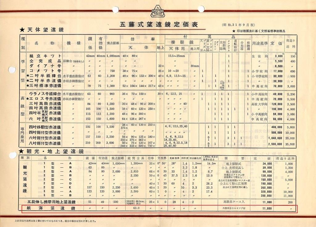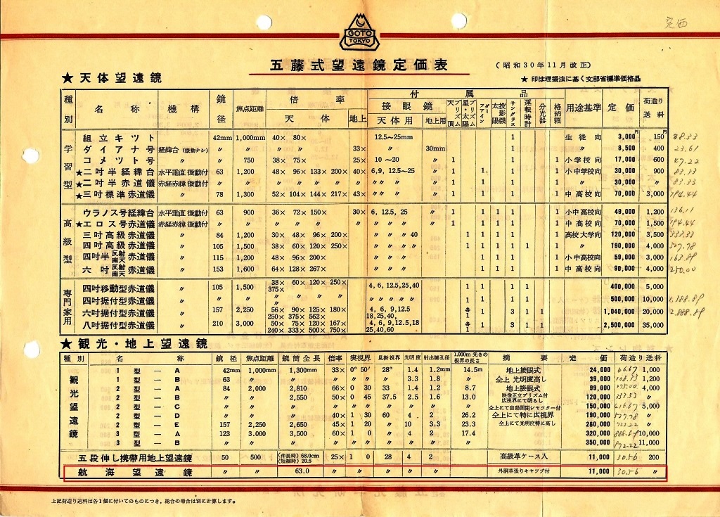 1955年11月(昭和30、11)の最後の行の隣の価格表には、50mmの絞りと500mmの焦点距離のアイテムが示されています。 これはこの望遠鏡の崩壊かもしれません。 誰でも確認できますか?