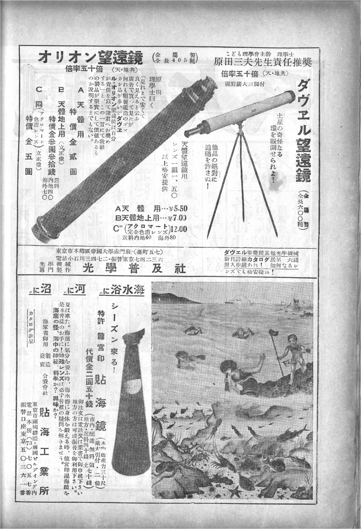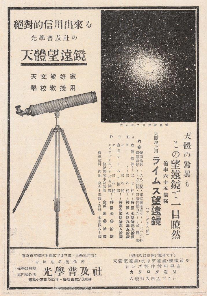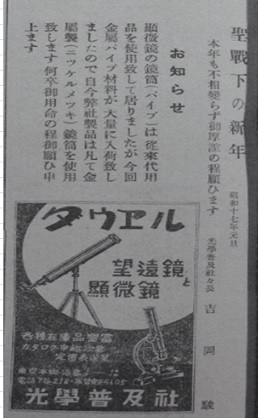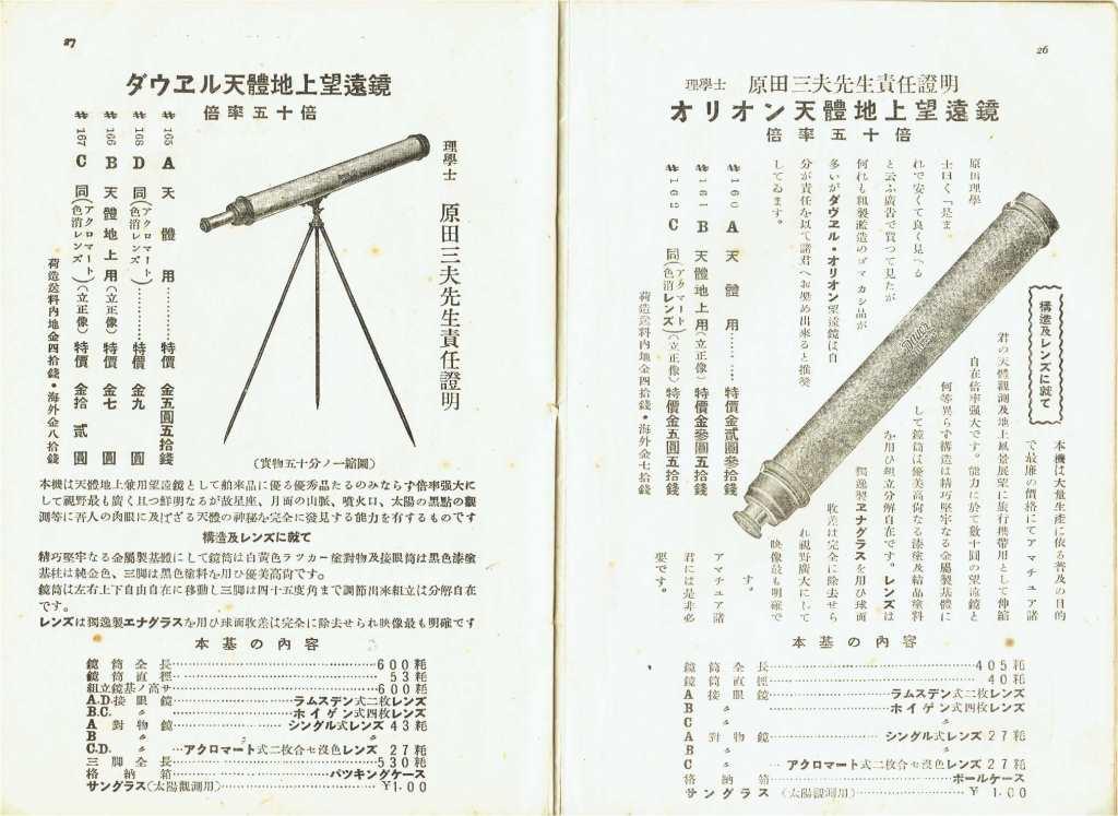 駄社の方は、四十ウン年の歴史をなんたらかんたらというお決まりの文句で、掏摸社の方は扱っていた望遠鏡のシルエットで広告していました。