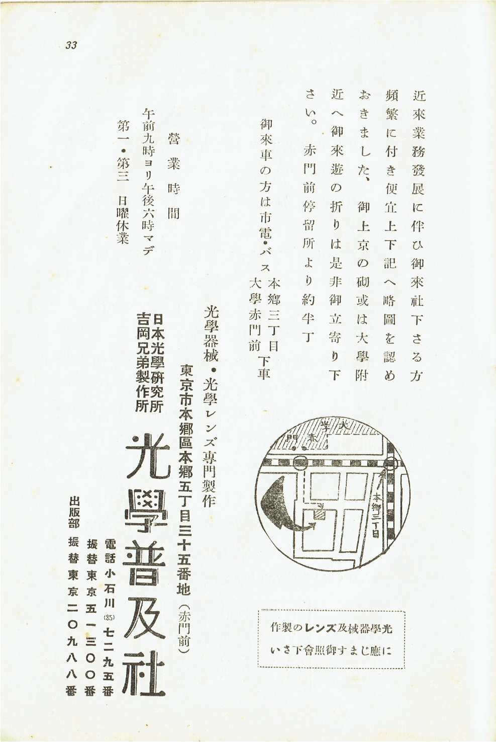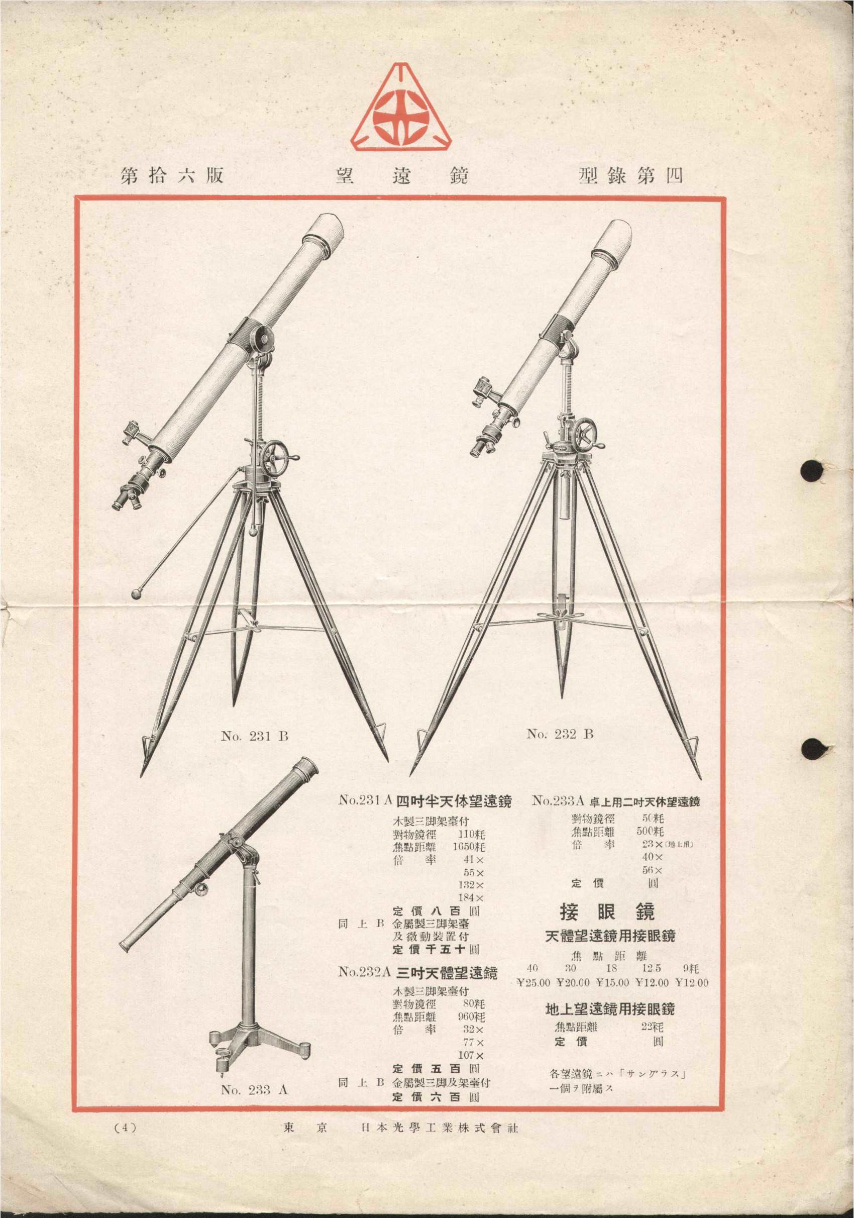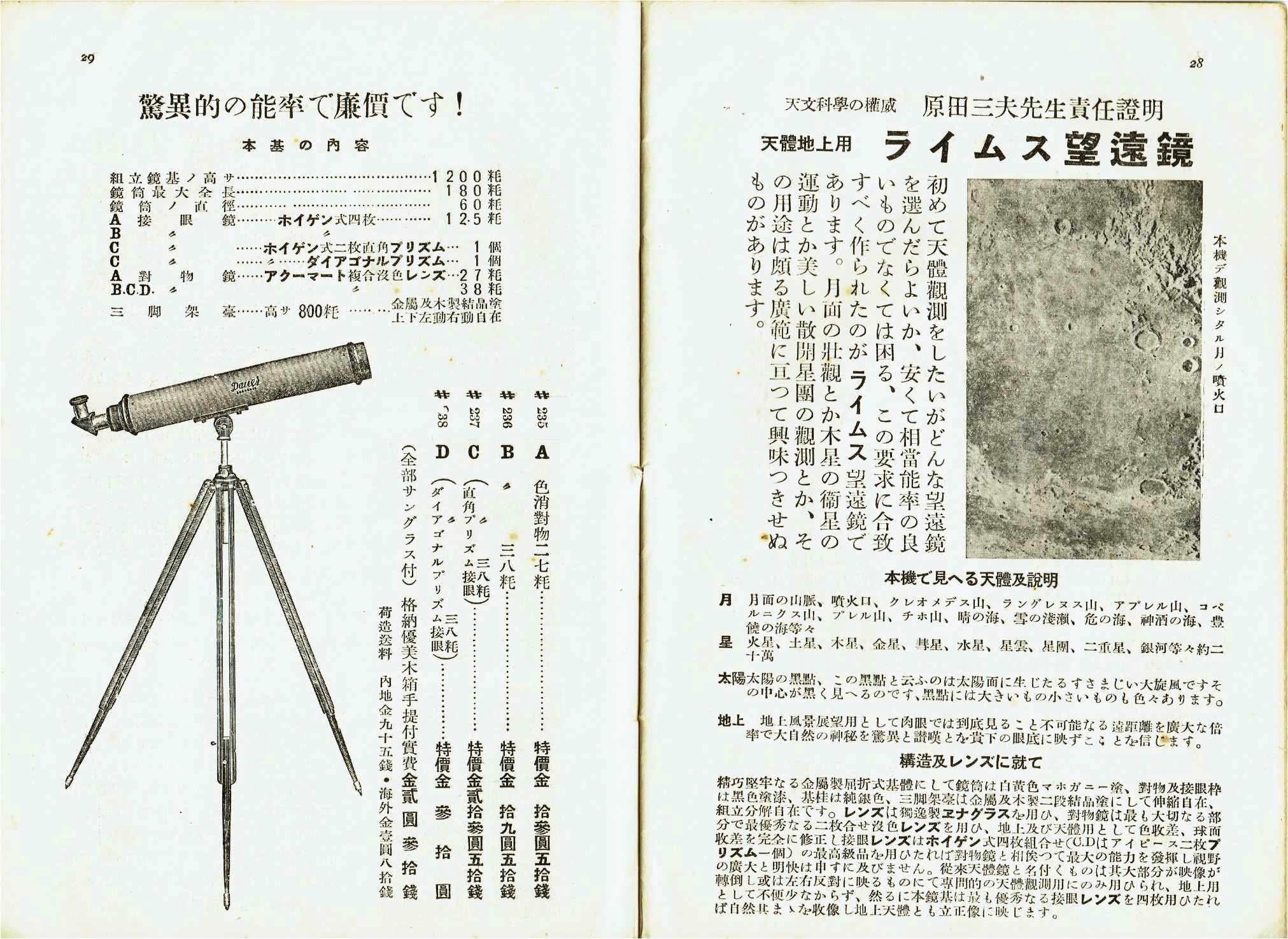 駄社の方は、四十ウン年の歴史をなんたらかんたらというお決まりの文句で、掏摸社の方は扱っていた望遠鏡のシルエットで広告していました。