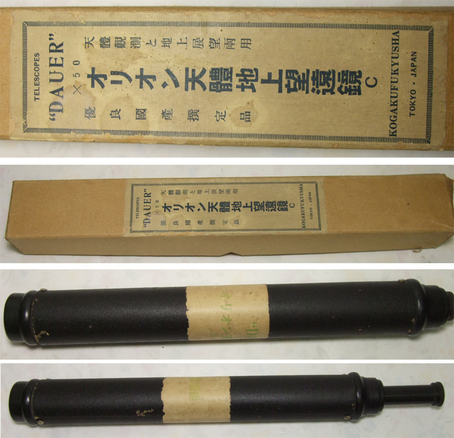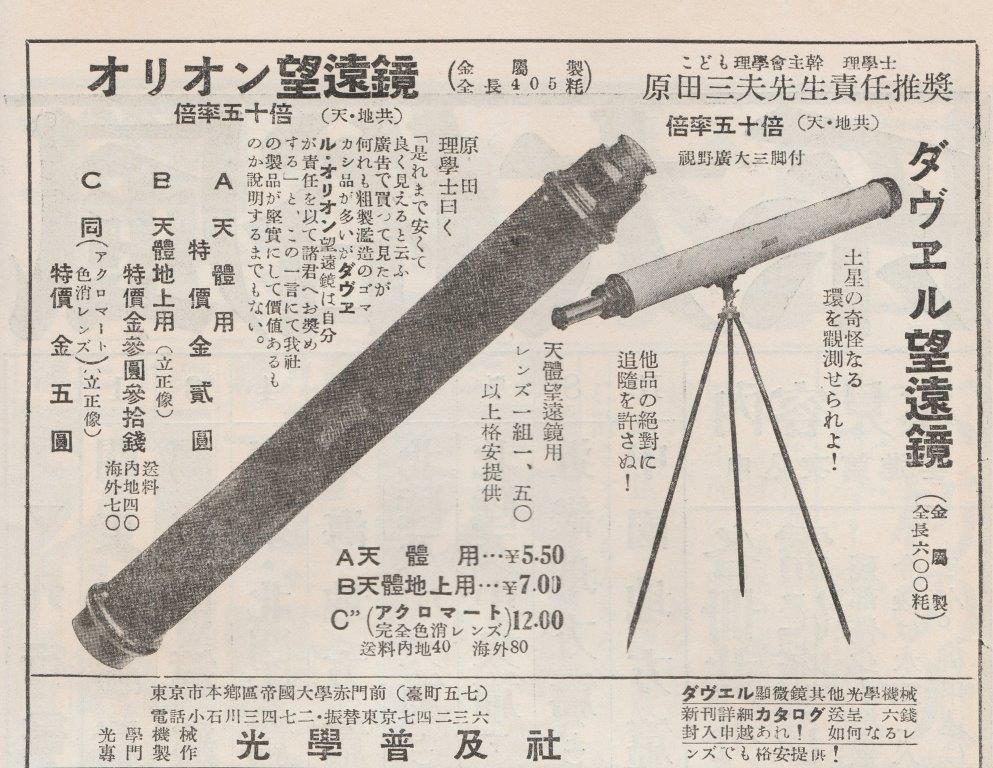 昭和7年の広告にすでにオリオン望遠鏡が載っておりますが、ダウエルブランドですが光学普及社での販売です。この頃の望遠鏡を集めており、写真添付しますが、「kogakufukyusya」ロゴが見えます。
