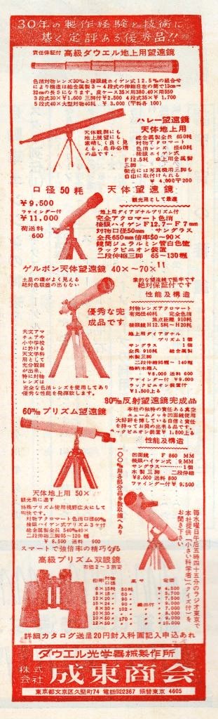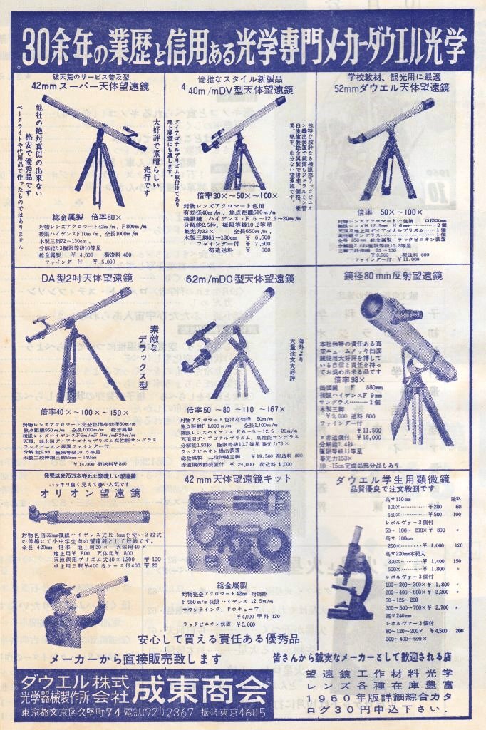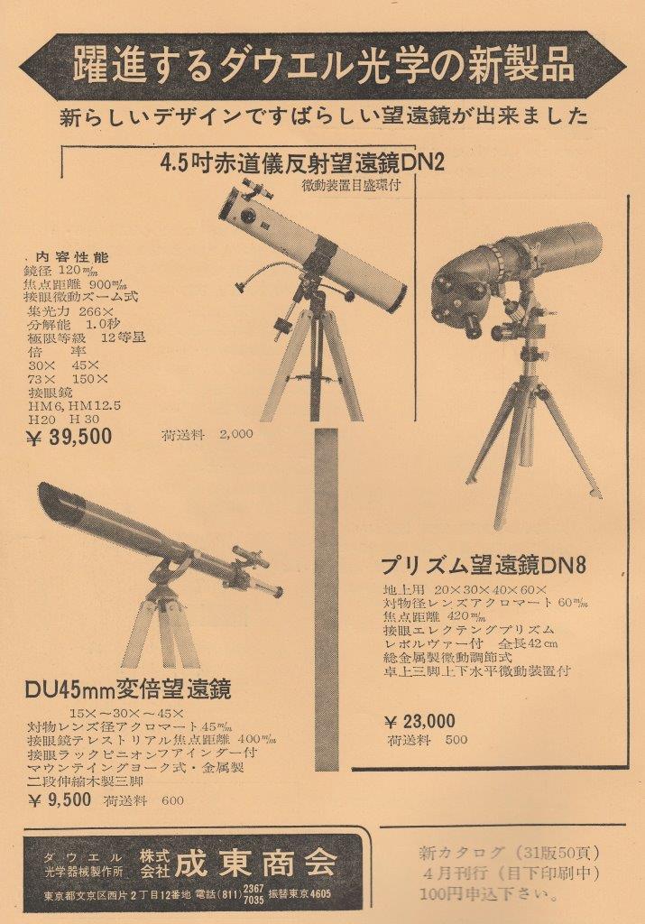 その雑誌広告を見ますと、昭和33年以降は”ダウエル光学機器製作所”が製造して、”成東商会”が販売しているかのように思えます。