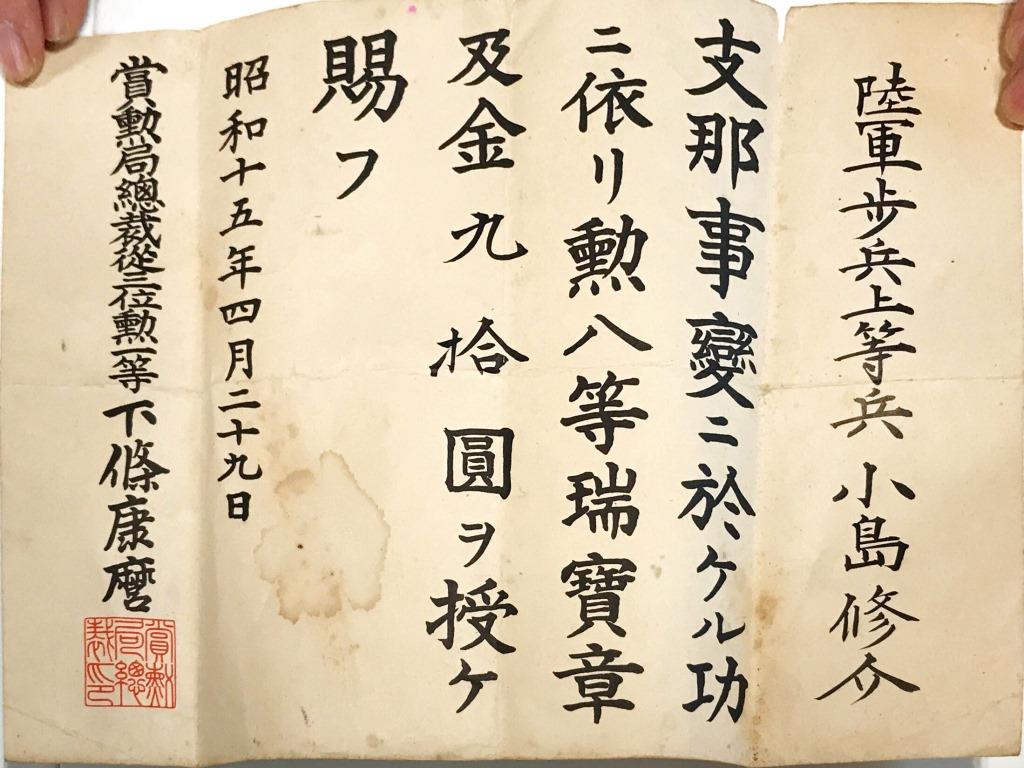 ちょっと補足しますと、五藤光学に在籍中、陸軍に招集されて(年代は正確には不明)従軍し、 支那事変がひと段落したので、国内の部隊に戻ってきます。(この時点で上等兵だったんですね) 当時、無事に戻ってきた部隊には多くの叙勲者がいたようですが、 それにしても叙勲されるとは。。。我々凡人には想像できないことです。 ここで注目は、中国戦線には一歩兵として従軍していたと点です。