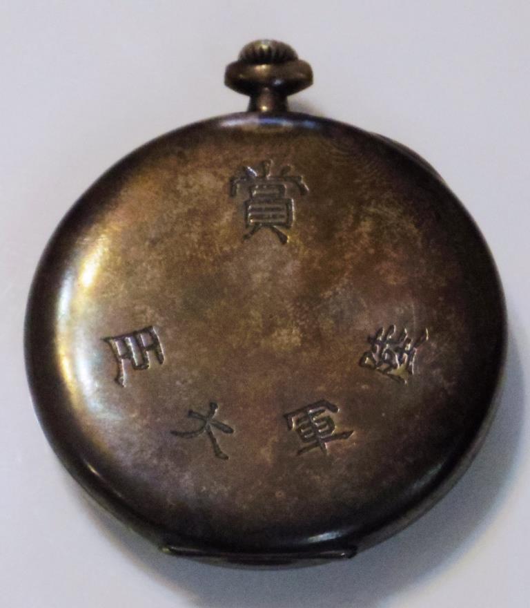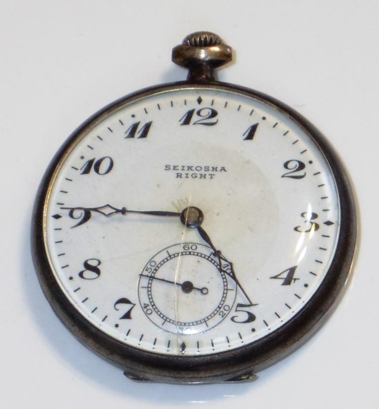 まだ、太平洋戦争が始まるまで1年以上あり、たぶんその間に相模原の陸軍兵器学校へ入学し、 主席で卒業します。 その時褒賞としていただいたという銀時計がそれです。 その精工舎の銀時計は裏蓋が開くようになっていて、大柄かつ精巧なムーブメントがよく見えました。 そしてネジを巻くといとも軽やかに動き始めました。 吊輪の金具が無くなっていて、それが外れた時に落下したのでしょうか、風防ガラスにヒビが入っています。 大切なのは、これで歩兵から兵科が決まった(軍隊のなかの技術職になった)ということです。 歩兵だったら生きて返ってこれなかったかもしれません。これも幸運です。 |