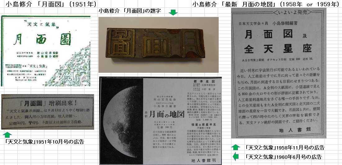 @ 「月面図」(1951年) 東亜天文学会月面課 小島修介 これが、今回いただいたコピーです。 A 「最新 月面の地図」(1958年?) 当初は日本天文学会々員 小島修輔 (題名も「月面図」) 実際には 日本テレスコープ社長 小島修介 → (亡くなられたので肩書なし) 小島修介 これには教授用の掛け軸になっいるバージョン(A全版、二色刷)があります。 「最新 月面の地図」の実物については、見たことがありません。 発行に合わせて小島修輔「新しい"月面図"の特徴」を「天文と気象」1958年10月号に載せています。