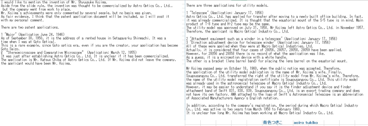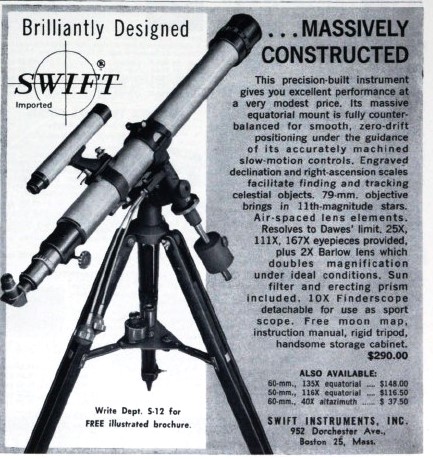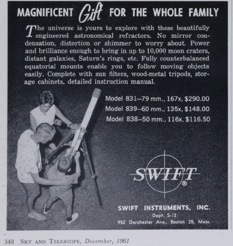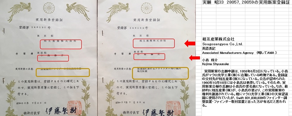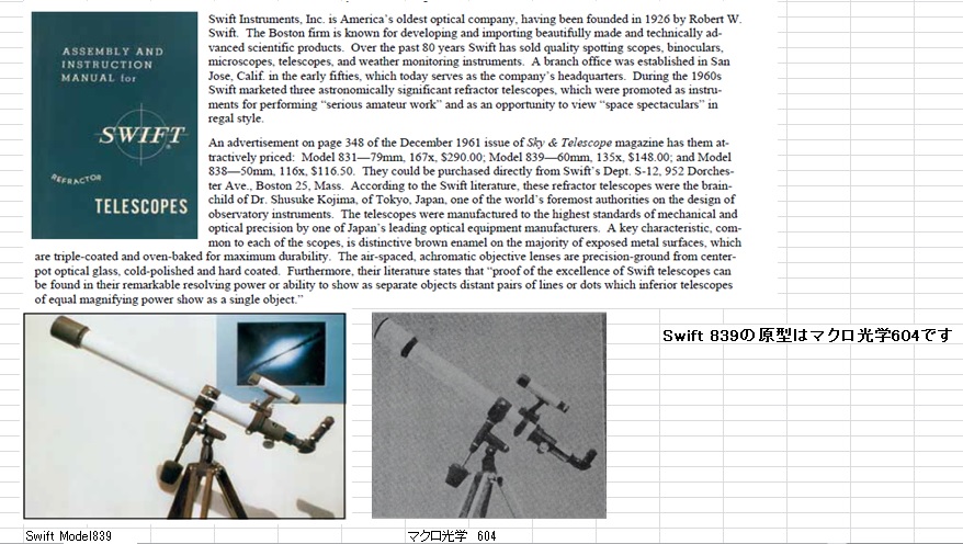 米国スイフト社が1960年に販売を始めた天体望遠鏡Swift831,838,839は 小島修介氏の創案に拠るものとの記載がありましたので添付して置きます。