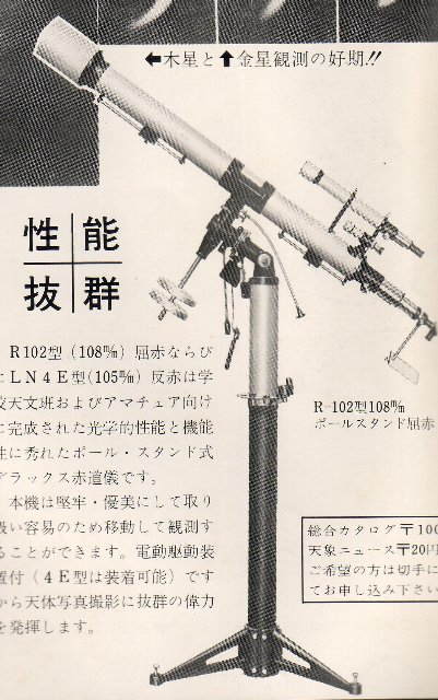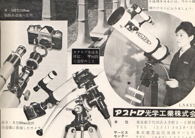 広告に社員の子供たちが登場するのは、この頃からだったのですね。 他のメーカーではほとんどない事ですが、アストロ光学はいつも社員のお子さんを出演させて、ほのぼのムードでした。