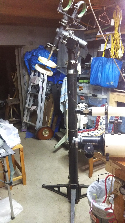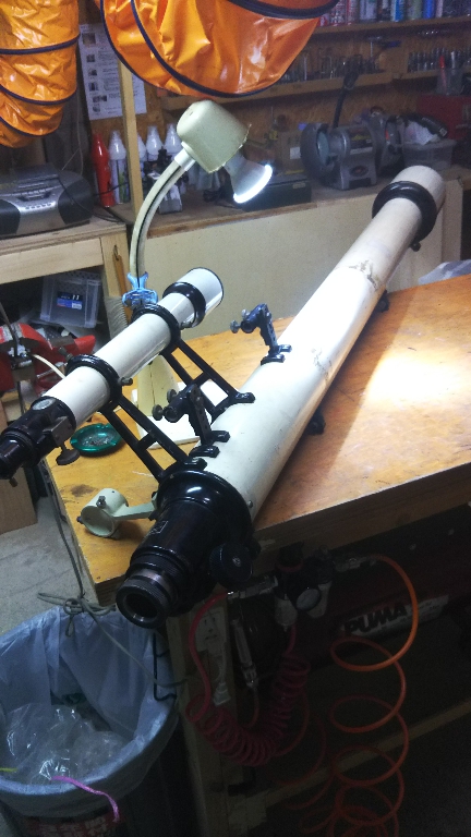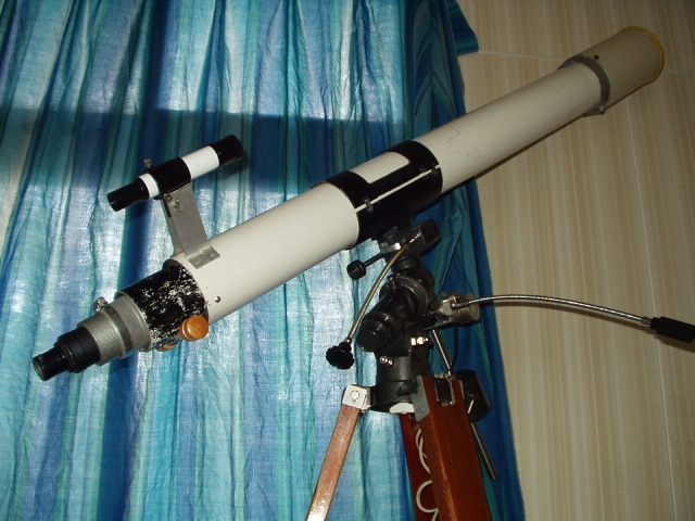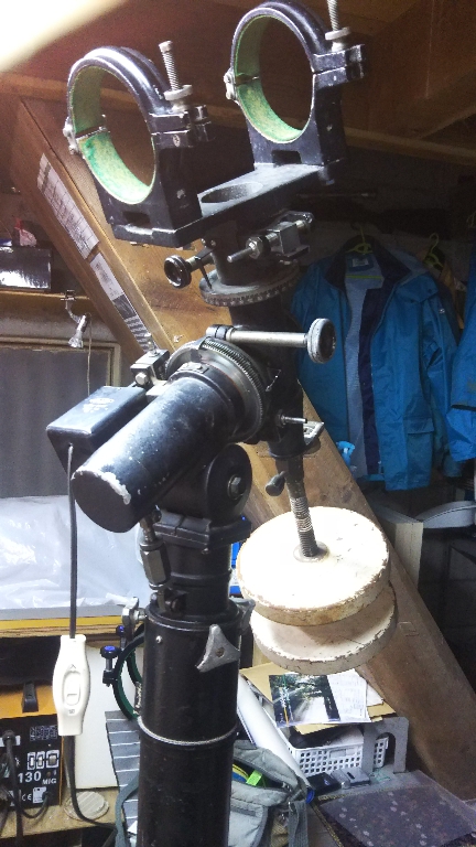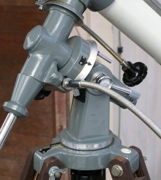 望遠鏡本体のみ昭和39年に購入し経緯台で使用し、その後LN6Eを購入して載せたそうです。 ご承知の通りLN6Eは反射用でしたので、特注で屈折用に足を長くし、バンドも作らせたとのこと。 R102用は高価で買えなかったとのことです。 強度の点ではLN6Eで十分で安価なLN6E+特注だそうです。