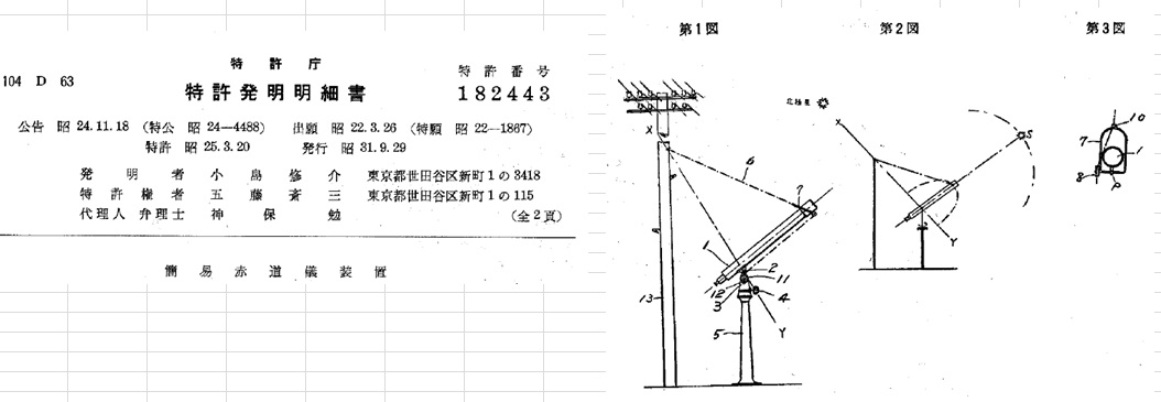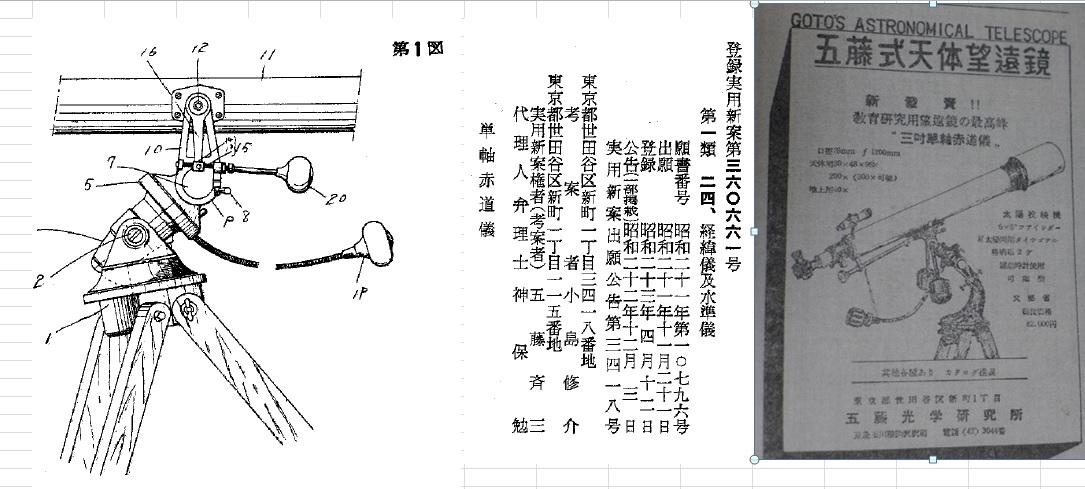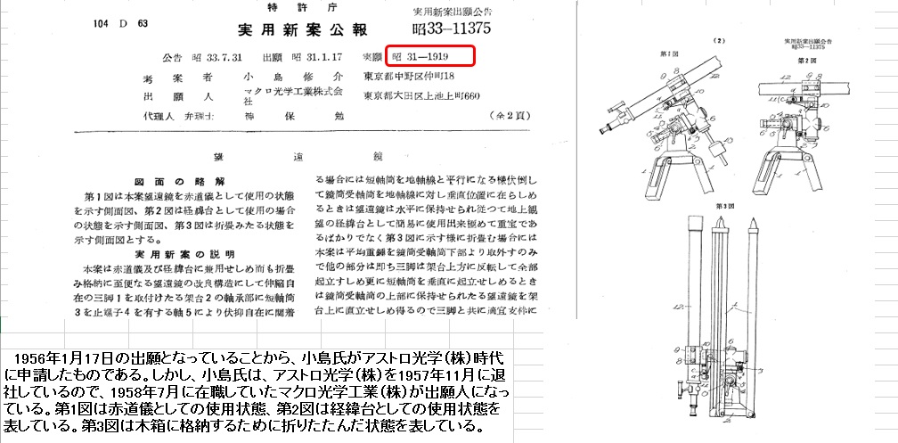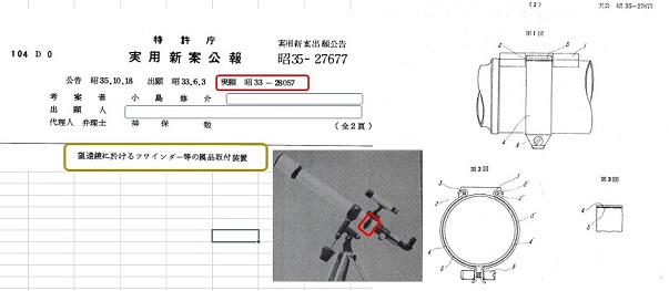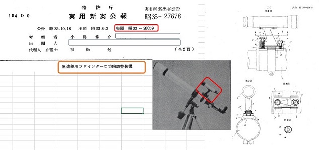 A「望遠鏡に於けるフワインダー等の属品取付装置」 (出願 1956年1月17日) B「望遠鏡用フワインダーの方向調整装置」 (出願 1956年1月17日) いずれもマクロ光学工業(株)に在職していた頃に申請されたものです。 実際には、28056,28057,28058,28059の4件が申請されたと考えられます。 しかし、28056と28058については、申請内容がどのようなものだったか、記録がありません。 推測としては、白い取っ手がついた微動装置です。もうひとつは、鏡筒を赤道儀に載せるための金具 (鏡筒バンド)です。