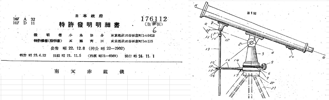 小島修介氏の旭光学工業時代は海上保安庁の勝浦水路観測所に納品された六吋屈折赤道儀の 設計製作がメインでしょうか。 小島氏は、この赤道儀を中折式と呼んでいます。 これは、アストロ光学(株)にも引き継がれており、四吋屈折を載せた赤道儀にも使われています。 アストロ光学工業(株)のR102の赤道儀は、これの縮小版です。