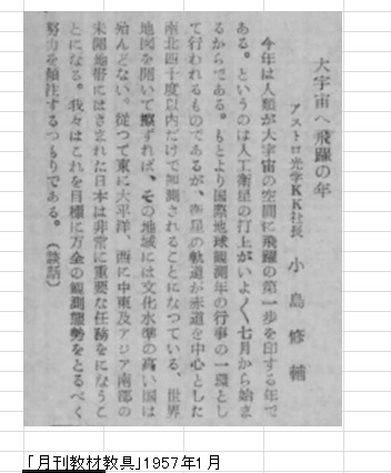 小島修介氏の天象普及協会及びアストロ・サービス・センター時代の活動については、十分な情報がありません。 現時点で知る限りでは、「天文と気象」誌と「月刊教材教具」誌に掲載された以下の広告と、「月刊教材教具」誌 に連載された「天文教材の扱い方」、「子供の科学」誌の天文欄です。 他には、草下英明氏の「星日記」でしょうか。 活動期間は、幅を大きくとれば1951年初め〜1952年末。狭めても1951年3月〜1952年12月でしょうか。 五藤光学研究所を退職し、旭光学工業に勤務するまでの期間です。