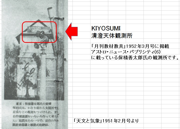 アストロ・サービス・センターの広告 「天文と気象」1951年4月号に掲載 ★望遠鏡や部品がこわれていませんか ★天文器械や図書の選択に迷いませんか 天文の研究や教育に、いちばん苦労するのは、器械の修理や入手の困難と不安にあるようです。今度 こういう要望にこたえて生れたのが、アストロ・サービスです。私共は、この方面の仕事には一応の 経験もあり、直接専門家の方々や、良心的メーカーとの密接なる連絡もありますから、皆様の御役に 立つものと信じます。研究家、学校、団体を問わず、遠慮なくご利用下さい。質疑応答、器械の取扱 法や、観測指導も致しております。なお、私共の扱う製品は新規、修理とも全部アストロナンバーの 一連番号によって、何時までも責任を持つことを誇りとしておりますから、この点でも御安心願える と思います。 「天文と気象」1951年6月号に掲載 "天象普及会"は、天文の普及をあらゆる方面と連絡して有機的にするため"アストロ・サービス"を設け、 天文に関する機械、図書の購入斡旋や修理改造、研究自作之の協力指導等を奉仕的に行い、各地の学校や 熱心なアマチュア天文家に喜ばれ心易く利用されています。 「月刊教材教具」1951年9月号に掲載 アストロ・ニュース・パブリシティ(三) 九月から十月にかけて東北地方及び中国、四国九州方面に天文講習並に光学機械 出張修理を実施しますから、この方面より御申込があれば、スケヂュールの中に入れますから至急 御問合せ下さい。 「月刊教材教具」1951年11月号に掲載 アストロ・ニュース・パブリシティ(四) 九月下旬、水沢の緯度観測所の六吋屈折赤道儀の修理を実費で修理して参りました。 現在、都立高校の六吋屈折赤道儀、海上保安庁の十吋カセニュートン式反射鏡、倉敷天文台 の十二吋ニュートン式反射鏡、日吉天文同好会及び九州大学の十八吋反射望遠鏡の修理、 設計、製作等々を依頼されてをります。 「月刊教材教具」1952年3月号に掲載 アストロ・ニュース・パブリシティ(6) 今度、次のような天文の会が出来ました。 東京都江東区深川三丁目清澄公園前 清澄天体観測所内(保積方) 天文クラブ この会は、始めて天文を学ばれる方のために、天文を楽しく、有意義に語ろうという集まりで、機関 紙「十億光年」を発行しております。会員は全国的に散在しておりますが連絡所(本部)には、九吋ドイ ツ型反射赤道儀を設置し、観測も致しております。とくに、小、中、高校の先生方に御入会をおすすめ します。望遠鏡の取扱いや、実地天体観測案内も実施しております。会則その他は天文クラブ宛お問合 せ下さい。