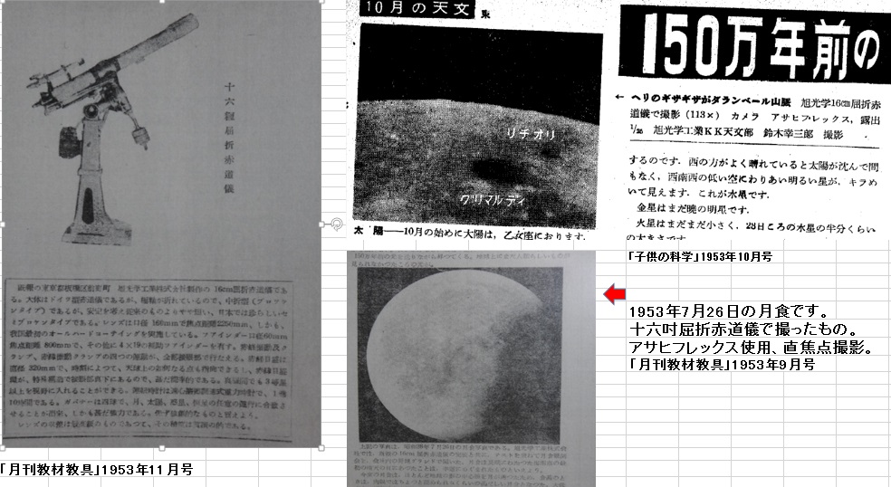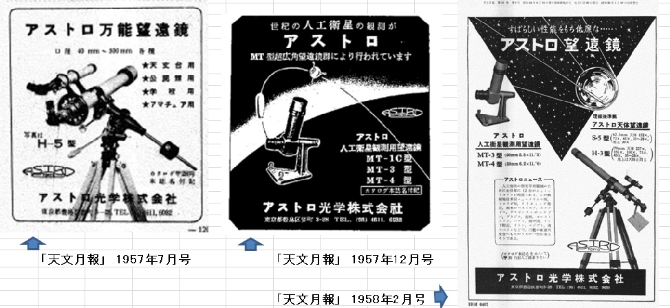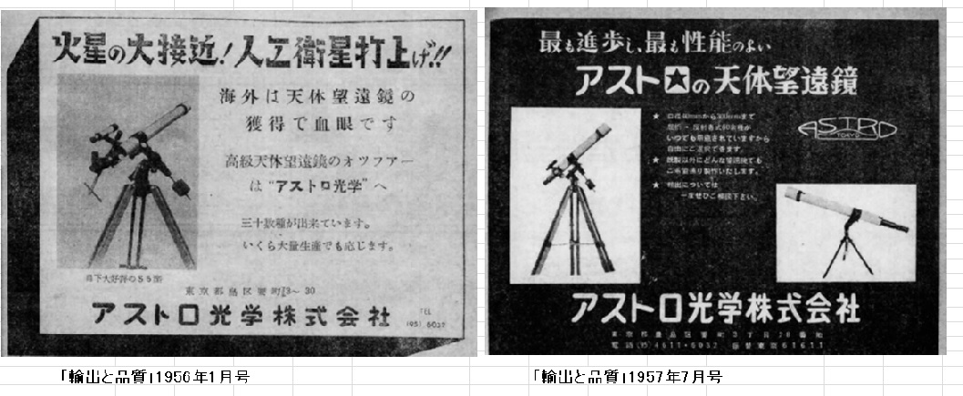 また、アストロ光学(株)時代には、 「反射望遠鏡の製作ガイド」『科学画報』1956年7月〜9月号 「天体望遠鏡の作り方」『子供の科学』1956年8月 があります。 「天体望遠鏡の作り方」は屈折望遠鏡編です。 どちらも、アストロ光学(株)の自作キットの宣伝の意味合 いが強いです。