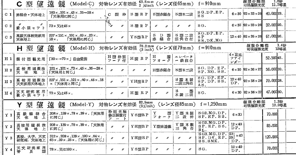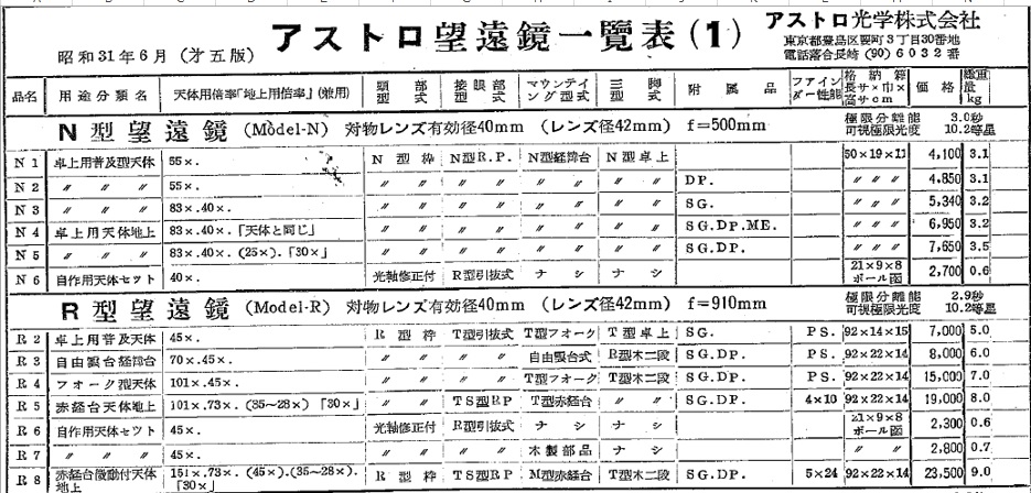 前期は、小島修介氏の設計思想を汲んだ望遠鏡、その改良型を製造販売しています。 いま、私が興味があるのは、D=60mm f=1200mmのR61-D型の前身のR60型?です。 1958年以降の輸出を考えても、木箱の寸法は制限が多々あったと思われます。 アストロ光学(株)及びアストロ光学工業(株)の主力商品でもあったf=910mm の 望遠鏡の木箱に、当然、新型のf=1200mmの鏡筒は収まりません。 鏡筒の一部をスライド(使用時は引き伸ばして、保管時は縮めて)させていた? R60型? ご存知ありませんか。 それとも、木箱も大きくなった? アストロ光学工業(株)の初期のカタログ、1958年〜1960年代前半のものを見てみ たいものです。