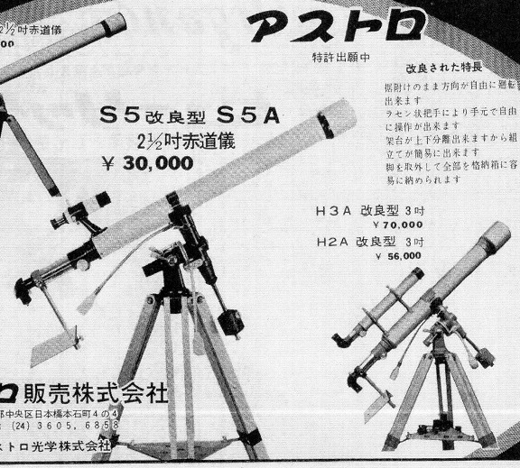 話しがややこしくなりますが、アストロ販売(株)という会社が1959年頃から 「月刊教材教具」に広告を載せます。アストロ光学(株)の販売店的なイメージ です。アストロ光学(株)の製品を販売しています。S-5赤道儀の改良型S-5Aという のを販売しています。赤道儀本体と三脚台座が分離できるようで、実用新案申請中 と書かれています。アストロ光学工業(株)ではなく、アストロ光学(株)の 販売店的なイメージです。アストロ光学工業(株)とアストロ光学(株)とは、厳密 に分けて考えないといけません。S-5A赤道儀を考えたのが誰なのか。興味は、そこに 尽きます。