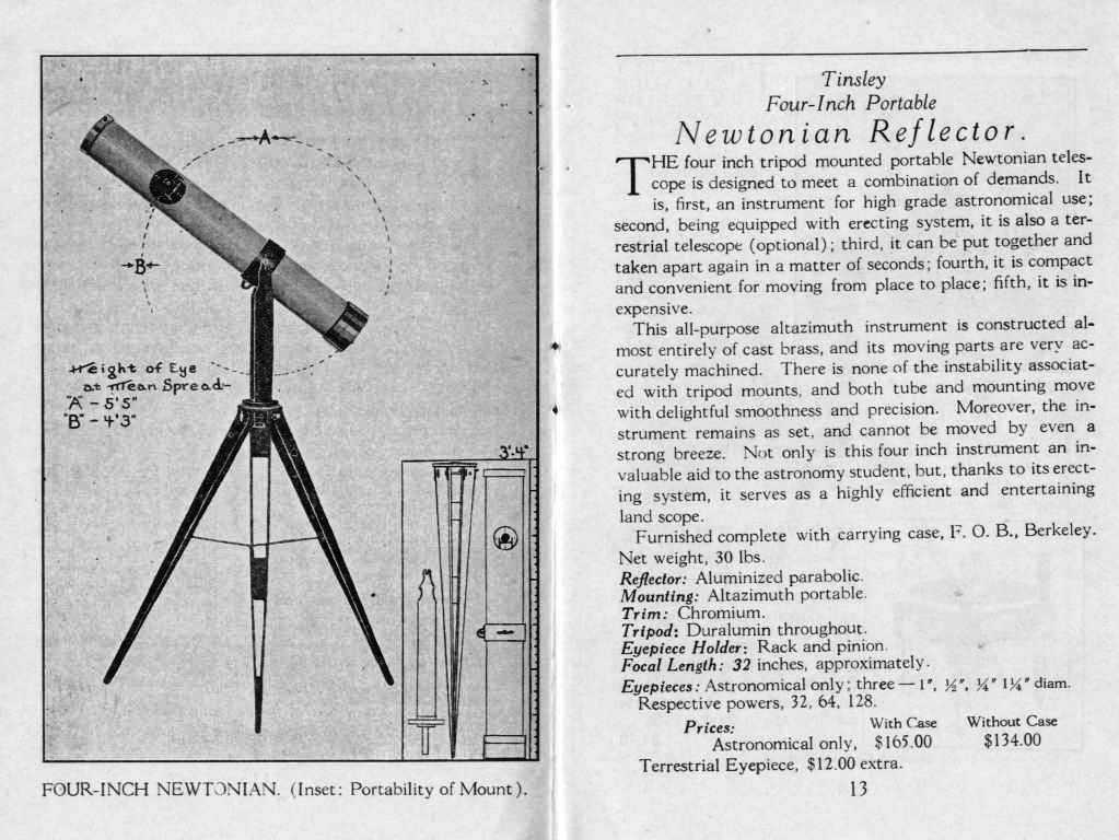 ガラクマさん、皆さんこんばんは Stewさんこんばんは 膨大な天体望遠鏡とその生産の歴史のレポートをありがとうございます。m(_ _)m 翻訳した日本語も良く分かります。 このような文章は専門用語を翻訳した物は、むしろ判別が出来るので良い傾向です。 ガラクマさん、以前にも紹介カタログを掲載したTinsley社ですが、天体望遠鏡も 作っていたんですネ。8^0^8 なるほどこの形は使い易そうです。簡単明瞭でシンプルイズベスト! 今一度Tinsley社の紹介をしますが、どんな物でなにやっているか?はここの板の方なら 良〜く判ると思います。(^0^v 先刻、オリンパスのカタログを捜していたら運良く出て来ました。。怪我の光明か?