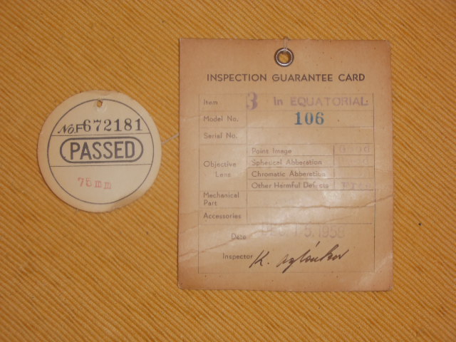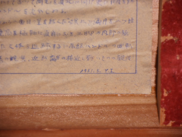 Stewさん みなさん こんにちは 以前撮影した黒色3号機の木箱の写真をよく見ましたら、蓋の裏側に次のように書かれているのに気が付きました。 望遠鏡(Telescope) 昭和24年3月30日購入(1949 March 30th Perchased) 24,800円(24,800Yen) 高等学校(HighSchool) また、児玉氏の五藤式望遠鏡の製作年代特定表を見ると、世田谷の住所が出てくるのは、1932〜1939と、もう1カ所1943〜1963の2カ所あります。2カ所目で、ZEUSと重なるところもあります(1943〜1952)。 以上より、2回目の世田谷時代の可能性があると思います。