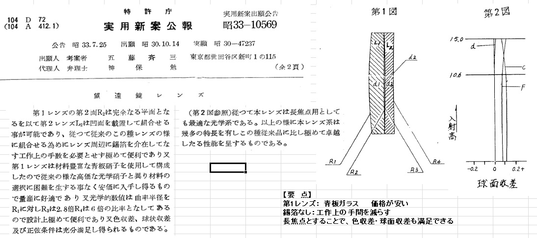Stewさん、みなさま、こんにちわ。 五藤光学の対物レンズの調査は、すばらしく、とても興味深いです。 五藤光学の6cm F=20 の対物レンズの実用新案はこれです。 五藤光学の対物レンズについての実用新案(3310569)の概要を添付しておきます。 1955年10月14日に申請されています。 この対物レンズの特徴は a.第1レンズの材料は青板ガラスです。青板ガラスは価格が安い。 b.工作上の手間を減らす為に、錫箔は使用しません。 c.長焦点に設計することで、対物レンズの色収差と球面収差を十分に補正できる。 レンズの曲率の比率 R1:R3:R4 = 1:2.8:6 R2 完全な平面 五藤光学が青板ガラスの在庫を抱えていたことが、設計の一因だったのでしょうか。 H10-20mm アイピースは、1.25inch(31.7mm)ですか。 はじめて、見ました。 ロッドさま、アイピースの情報、ありがとうございます。 TP-6mmについては、まだまだ興味が尽きません。 Swiftにも供給されたのに、シリーズ化はされていないんです。 全く、不思議です。