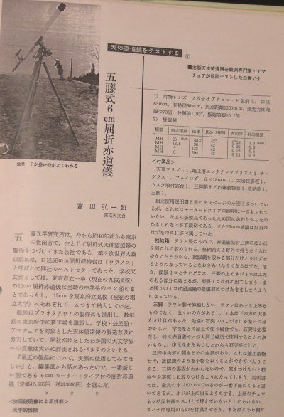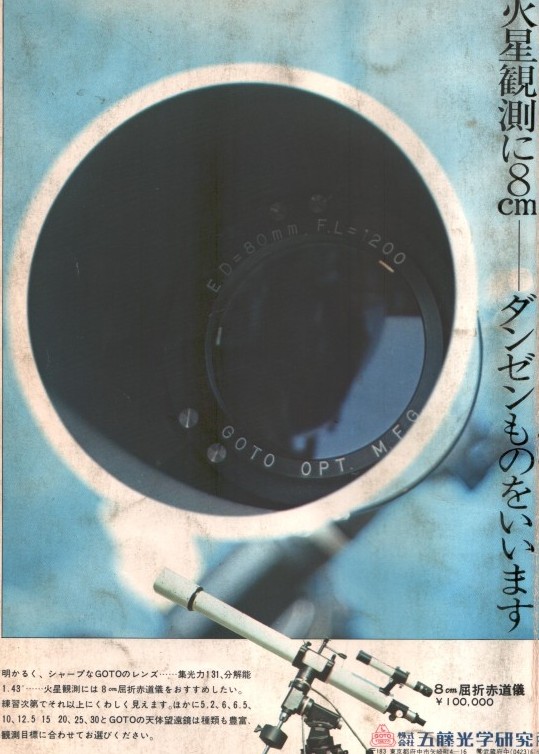 Stew様、はじめまして! 青色つきこ様、毎度面白い話題をありがとうございます。共感する部分が多いです。 Stew様の趣味は素晴らしいと思います。 よくこれだけの名機を集めましたね。貴重な文化財を多数収集され、もはや立派な博物館に匹敵すると思います。 また、我が国の光学製品をこれほどまで高く評価していただき、とても嬉しく思います。 私は過去には光学メーカーの社員でした。天体望遠鏡には特別のこだわりを持っていますし、そのもっとも基礎となるのは五藤光学の長年の蓄積された経験に基づく技術と、ユニークな設計思想だと思います。 五藤光学は我々にとって、もはや”神の領域”であり、現在は中古品しか入手できないし、それらの価格は高騰しています。 五藤 Model 106 76mm 焦点比はf / 17.3 これは過去の日本の高校ではスタンダードと言える望遠鏡でした。昭和33年(1958年)そんなに古い物だったのですね。 私の故郷の高校にもありましたし、最も五藤光学らしい望遠鏡だと思っていて、今も私の憧れです。 これが”Littrowレンズ”とはここで初めて知りました。 ”Littrowレンズ”は日本ではほとんど聞かれない言葉ですが、ヤーキス天文台の世界最大の屈折望遠鏡を始めとして米国ではポピュラーな設計思想とお見受けします。 この事は吉田正太郎氏の著書で知りました。 中心像はシャープだが、コマ収差が多く良像範囲が狭い。 しかし長焦点なので実用上まったく問題がない。むしろ技術的、製造上のメリットが大きい。 やはり”コリメーションは非常に敏感です” つまり光軸調整がデリケートだということですね。体験談として良く理解できました。理論と合致しています。 ↑にある1972年の60mmF15は私の中学校にありました。 当時新品でした。なぜならば、その前の古い五藤光学の60mm経緯台は対物レンズが紛失、三脚も紛失・・・ 空っぽの鏡筒と架台だけの残骸、ひどい状態でした。 それで、私たち生徒が学校に懇願して新しく買ってもらったのでした。 この望遠鏡で見た土星のリングは、私の家にあった10cm反射望遠鏡と同じぐらいの解像力だったので驚きました!! 五藤光学の望遠鏡は機械部分の設計思想や加工精度も、他社とは全然レベルが違うと実感します。 たとえば微動装置の動きの感覚や、クランプのフィーリングは、他社のどの製品にもない、しっくりとした素晴らしい安定感を感じました。 とてもシンプルな構造なのに、他社が真似しても、絶対に真似できないほどの不思議な要素があると実感します。 これは何なのでしょうか?そして素晴らしい耐久性、外観の芸術的な美しさ。 あの頃の古き良き時代の熟練工、まさに芸術家のような人が丹精込めて作った物だから、後世の他の人達には真似ができないような名人芸なのかもしれません。 だから今後も、この愛すべき五藤光学の製品たちを文化遺産としてずっと大切にして欲しいと思います。 一方、私が今愛用しているのは五藤光学とは敵対関係にあったアストロ光学の製品です。 正直言って五藤光学には負けますが、軽量で扱いやすく別の意味でメリットが多いので私の使用目的には良く合っています。 しかし根底に流れる設計思想には共通性がありますね。 小島修介氏は、なんと言ってもやはり五藤光学で育った人材だと思います。 それは彼が作った製品を見るとわかります。 しかし新しい時代に向けて、彼独自の発想で大胆に変革されているのがわかります。 現在の極めて完成度の高い高橋製作所の製品も、小島氏の影響を強く受けた高橋喜一郎氏の方針で発展して来たのは、疑いのない事実です。 そういう歴史的なストーリーはとても興味深く思います。 小島修介氏は五藤斉三氏ともに、歴史に残る偉大な人物だと思います。 私は高橋喜一郎氏に何度も直接お会いできて、親しく助言いただいたのはとても光栄で幸運な事で、一生忘れられない幸せです。彼は地味な職人風でしたが、全身から光を放つような人物でした! 古き良き時代でした。あのような時代は、もう来ないのでしょうか? ↑の”五藤 Optical Hershel対角プリズム”ですが、 日本では「星太陽両用プリズム」と呼ばれていました。 これは面白い設計ですね。昔の五藤光学には、このような面白い発明品がとても多くありました。 画像は、1970年の五藤光学の広告です。 魅力的な製品が満載ですね!! PS;私は初歩的な英語なら一応は書けますが、間違った表現などあるといけないので、日本語で書きました。 できるだけ翻訳しやすい文体で書くように配慮したつもりです。 若い頃はたった1人で外国へ放浪の旅をしたこともあり、しかし英語はもう30年も使っていないので忘れましたが、興味が湧いてきたので、これを機にまた勉強してみたいと思います。