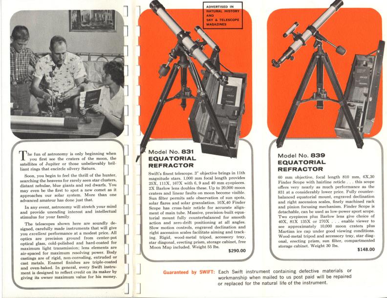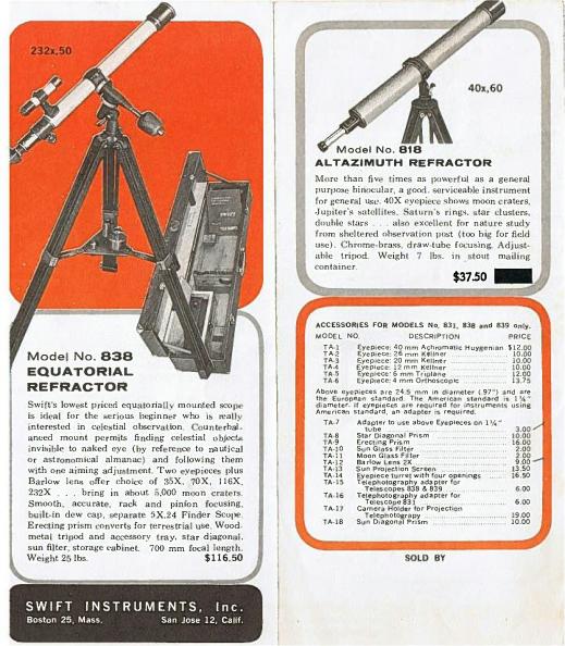 The 1960 Swift 831 has a sliding lens shield and after 1960, they had helical lens shields. Only the 1960 831 had a rectangular label on the focuser and mine has a different scope on the back of the label!