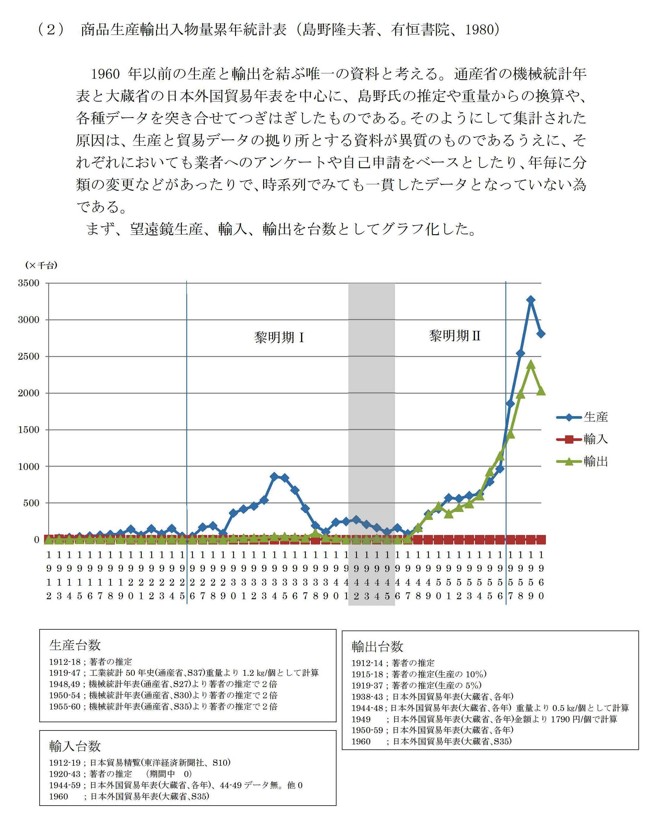 みなさま、こんばんわ。 「検査年報」工業品検査所(通商産業省)という資料があります。輸出用の光学機 器は双眼鏡、顕微鏡が主として検査対象となっていて、天体望遠鏡については地 上用望遠鏡やライフルスコープとともに単眼鏡として扱わていたりします。天体 望遠鏡という括りがないです。 でも、ところどころに天体望遠鏡についての記載がありますので拾ってみました。 昭和30年(1955年)前半ににアストロ光学が輸出を開始し、天体望遠鏡が飛躍的 に輸出されたのかと思っておりましたが、文面からは、そこまでは読み取ませ んでした。 ガラクマ様が載せてくれた卓上型のジュピターですが、ラックピニオン式で片側 のみのハンドルが特徴的ですよねぇ。 昭和30年度(1955)〜昭和40年度(1965)版を調べてみました。 昭和30年度 P-22 (4)望遠鏡 望遠鏡は相変えず小型望遠鏡が圧倒的で、約31,140本、天体用望遠鏡は539本、 ライフルスコープが約5,105本で昨年度に対してそれ程の増減は見られなかった。 天体望遠鏡が安定していることと、価格の点で今後相当伸びる可能性がある。 昭和31年度 P-22 屈折望遠鏡の検査件数 東京地区 5件 昭和32年度 P-27 屈折望遠鏡の検査件数 東京地区 18件 昭和32年度 P-28 (3)屈折望遠鏡(単眼鏡) 輸出量は漸増の傾向にあり、新設計により機種も多様となって来たので、従来 の輸出標準に大幅の改正を加え実情に合うものとした。なお33年2月から輸出 検査法の施行に伴い(財)日本望遠鏡検査協会において輸出検査を行うことにな った。 昭和34年度 P-40 単眼鏡については天体用その他について漸増の程度であるが、地上(正立用レ ンズを用いたもの)の小型のものが一時的に輸出量が多く注目を浴びた。 昭和35年度 P-66 次に単眼鏡の本年度中指定検査機関が表示を行った数量は39万1千個であり、 これも34年度の44万6千個に対して12.5%の減となった。これは34年中に正立レ ンズを用いた地上用(対物レンズ径が30mm程度のもの)が異常に多かったためで 、その他のものは増加している。殊にガンブームに刺激されたためか射撃照準 用のものが急増しているのが注目される。 昭和37年度 P-34 前年度における双眼鏡、望遠鏡関係の輸出は価格の不安定、生産過剰等の原因 により伸び悩みの傾向が見られ、倒産したメーカーもあらわれて、いろいろの 問題を残したが、本年度にはいって、数量的にも、価格的にも安定をみたこと は、誠によろこばしい。 昭和38年度 P-33 過去数年間、双眼鏡、望遠鏡関係の輸出は価格の不安定、生産過剰等の原因 により伸び悩みの傾向が見られ、倒産したメーカーもあらわれて、いろいろの 問題を残したが、前年度あたりから安定しはじめ本年度も引き続き堅実な伸長 を続け前年度に比し数量的にみて双眼鏡にあっては14.2%、地上用単眼望遠鏡 では34.3%、天体用単眼望遠鏡7.2%、射撃照準用単眼望遠鏡31.7%となった。 特に単眼望遠鏡の伸びが著しかった。