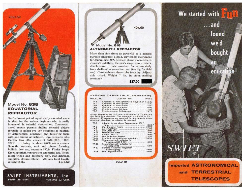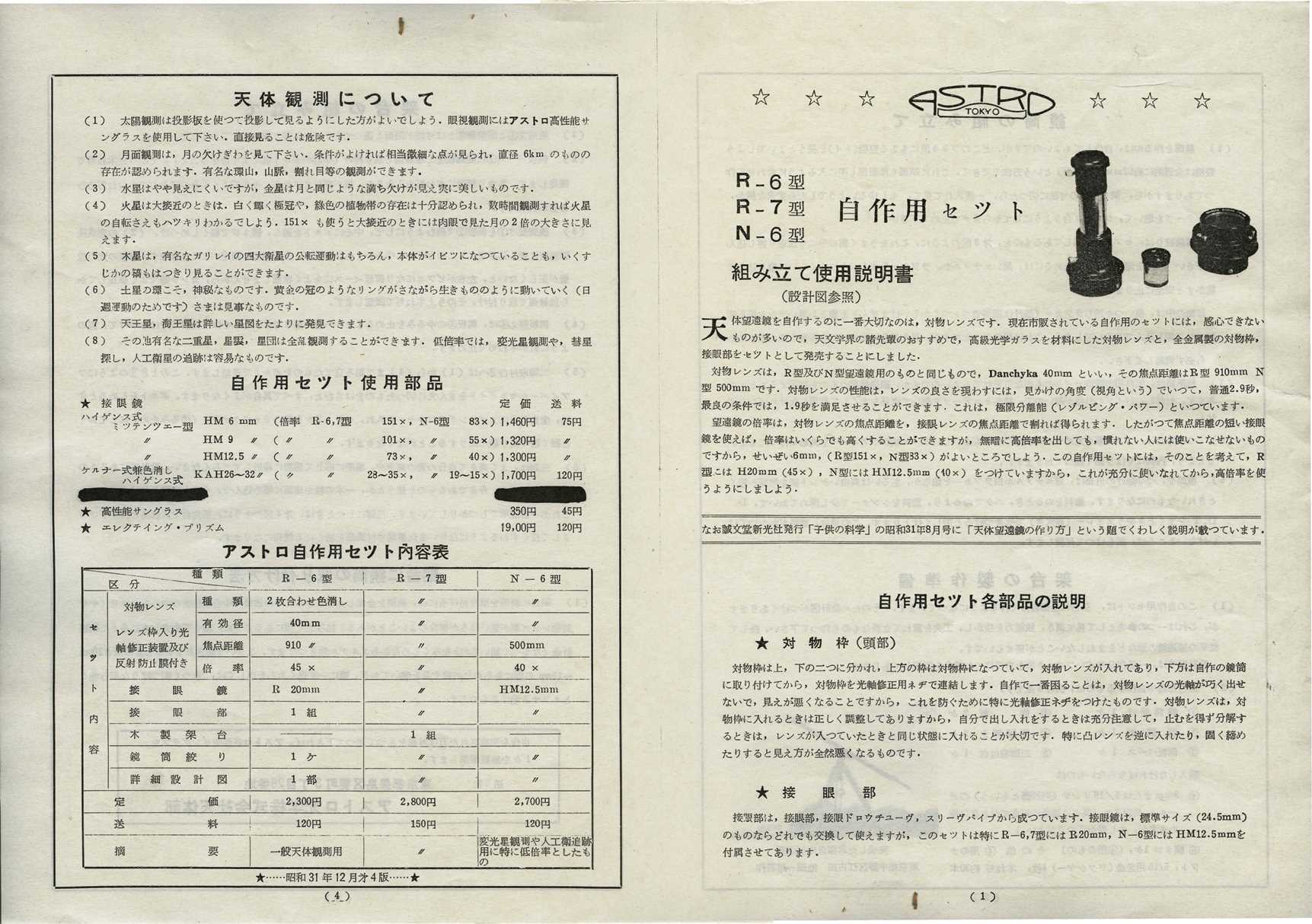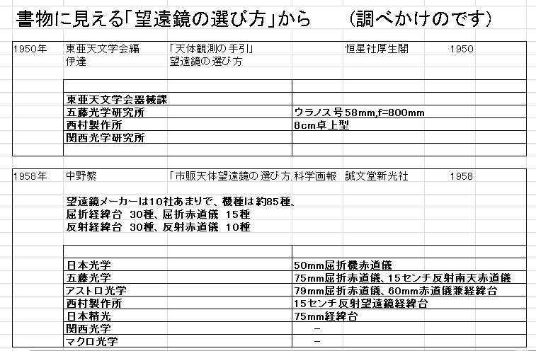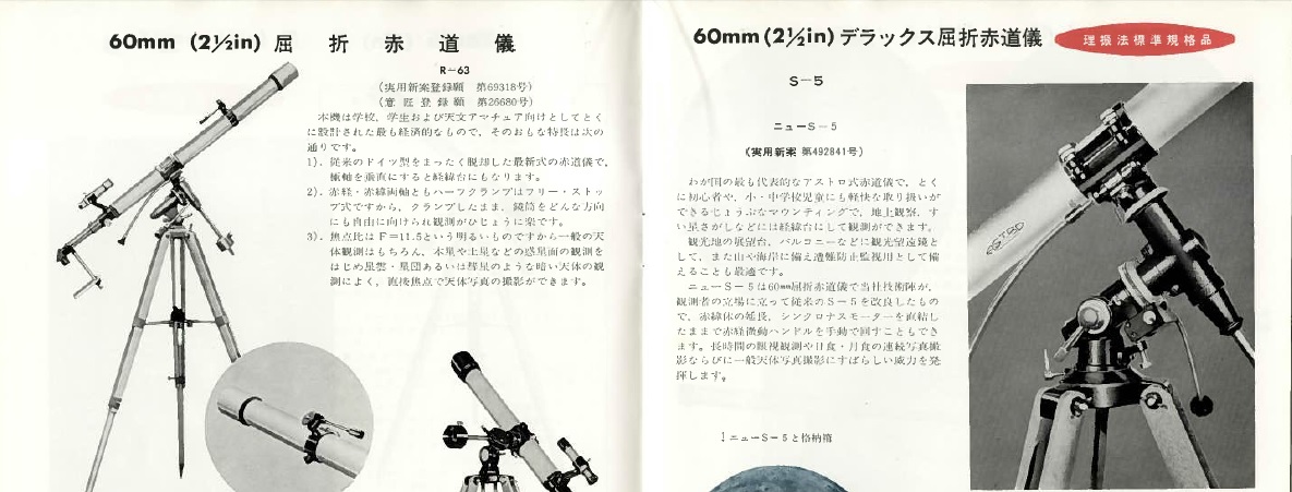皆様、本年もどうぞ宜しくお願いします。 ↑のPDFファイルの赤道儀は60年代のミザールアポロ型に似ています。ニューアポロの初期型までは同じでした。 つまり鏡筒バンドは閉じたリングなので、鏡筒の取り外しができない。 バランス調節は2本の止めねじを緩めて、鏡筒をスライドさせます。 どうしても取り外したい場合には対物レンズを外します。 人工衛星用望遠鏡も同じ構造でした。画像はそのパーツを利用して改良した私のカートン光学の経緯台です。 ビクセンの60年代のジェミニエーターやエクスターも同じ構造でした。 しかしこれらは鏡筒を外すのに不便なので廃止になりましたね。 三脚をグルリと反転させて格納するのは良いアイデアですが、これも現在は採用されていませんね。 これは昭和33年。 ということは亡くなられる2年前です。この短い期間にすごく多くのお仕事をされたのでしょう。 五藤斉三氏は「酒に溺れて死んだ」とか散々な事を書いていますが、今で言う過労死ではなかったでしょうか? マクロ光学ですが、 最初のアストロ光学を設立したものの、経営がうまく行かなかったのでマクロ光学に軸足を移したのでしょう。 そして輸出に本腰を入れようと頑張った。 マクロ光学の輸出部門を独立させて日本テレスコープ社を設立した。 スイフト社で販売されていた製品はアストロとは一線を画し、エイコーに酷似しているのも何かそういう事情があったものと思います。 そうなるとアストロとエイコーの関係よりも、高橋とエイコーの関係を調査する必要がありますね。 (冨所氏はエイコーとは関係ないと言っていました) 輸出用は別仕様という事で別製したのだと思います。一部ダブっている部分もありますが。 しかしわざわざfの違うレンズを作るのはコスト的に無駄です。 同じfなら同じ研磨皿、同じニュートン原器で製造できるのに。 ただ、50/700は後に60/700(R-63)になったでしょうし、60/810は800(ペンタックス)と同じでしょう。10mmぐらいの誤差は許容範囲内ですから、表示だけ微妙に変えるのは別のメーカーの製品であることをアピールするための常套手段です。 ちなみに、60年代にアストロは60/910ですがエイコーは60/900と表示されています。高橋は65/900でした。 77/1000は後にミザール68/1000や五藤65/1000になったかもしれません。 豊島区千早町の刻印があるアストロS-5は貴重品ですね! 画像の清原光学カセグレンにはマクロ光学と良く似たファインダーが付いています。