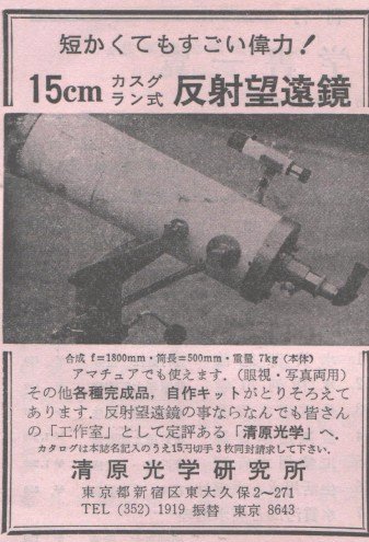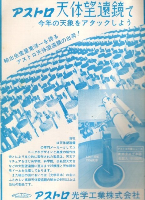 エド様 珍しい品物の入手おめでとうございます。 早速分解するのがすごい! インゲン豆効果がなくて覗きやすいのが一番ですね。 RKEはリバースドケルナーの略でしょうか。スペルを間違えるといけないのでカタカナにしました。 ケルナーをKでなくKeと刻印した物もたまに見かけますね。 低倍率用がメインのようですが、高橋のような高倍率用の6mmは珍しい存在ですね。 トリプレーンの解説記事を見つけました。 天体望遠鏡自作相談室(天ガ’76)にありました。 回答者は川村さん、さすがによくご存知ですね。 Nikonの5mmがトリプレーン(ケーニヒ)だとすると、覗きやすさを重視した高倍率用として優れているのでしょうね。 こういったシンプルなレンズ構成だとスッキリ見えて気分が良いですが、後年のスマイスレンズ採用のハイアイではその点イマイチな感じがします。 青色つきこ様 日本精光にもがぜん興味が湧いて来ました。 小島修介氏とは別路線だったのでしょう。 すごい力量の会社だったのですね。 昔々に工場見学に行った人の話を聞きましたが、レンズ研磨の現場も見せてもらったとかで、本格派です! 戦前戦中には光学兵器の仕事で技量を上げたんだろう、と想像できます。 戦後に起業して一気に素晴らしい発展を遂げたのでしょうね。本当に素晴らしい事です。 アストロのR-74がズラリと並んだ写真も見つけました。 冨所さんが月産1500台と言ったのはこれの事です。 昭和45年変光星図の広告です。 R-74は三越デパートで実物を見かけたような。 しかし国内ではあまり売れなかったらしく(カッコ悪い) ほとんど見かけませんが海外サイトでは良く見かけます。 これ、一番欲しい望遠鏡です。 見るからに貧弱ですが「微動だにしない!」という宣伝文句でした。(本当かなぁ?) アイピースは5個も付属していて、なんとOr4で300倍という暴挙!! 気になるAH40も付属していました。 アストロが大量に輸出する写真は、昭和45年頃の広告に出て来ます。 しかし三脚が丸型でなく角型なので旧型です。 少し前の写真だったとして、昭和40年頃に大量に輸出されたんじゃないでしょうか? 小島修介氏が亡くなられた後です。 このように何十台も並べて写真を撮るのは、それだけでかなり大変な手間です。 撮影のためだけにそんな無駄な労力を? (合成写真ではないか?という話もあったので、よく見てみましたが一台ごと姿勢が違います) たぶん、出荷前に全品組み立ててみて一台ずつ検査していたのではないでしょうか? 量産品では抜き取り検査が一般的なのに、とても良心的だと思います。 私が入手した他社製品では部品が不足して組み立てできなかったり、鏡筒バンドが不良でちゃんと固定できない物など、不良品が結構な高率でありました。 冨田氏のテスト記事でもそういう不良が多かったですね。