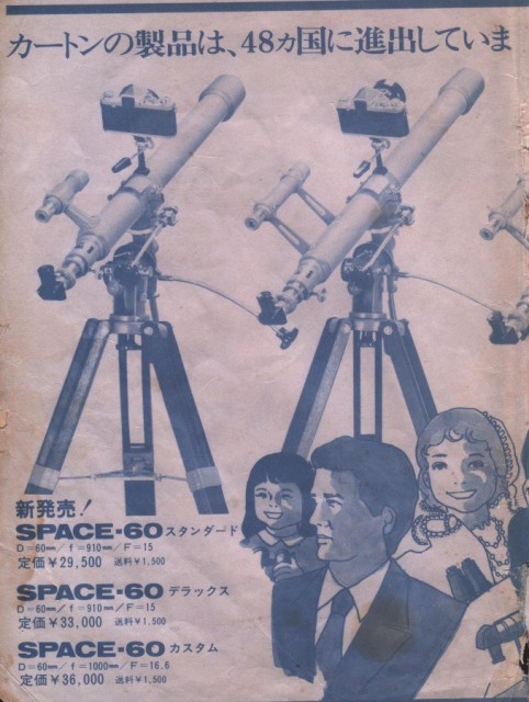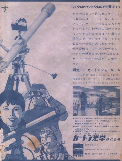 よく考えてみたら、 48カ国というのが引っかかります。 北米市場が一番の巨大市場なので「その他大勢」に手を出しても効率が悪い。 アストロ、日本精光は北米市場中心だったと思います。 つまり米国だけで十分な商売ができたはずです。 70年代の天文ガイドにフランスで愛用されている日本製望遠鏡が紹介されていましたが、東和製の11cm反赤でした。 同じ商社がアストロやカートンと、商売敵である東和の製品を並行して取り扱う事はないでしょうから、別の商社による輸出だと思います。 この前の資料を見ると、愛和商会という会社が昭和17年に日暮里で創業されていて、望遠鏡・双眼鏡と書かれています。 この会社、昭和40年代までKINGというブランドで東和の製品を主に取り扱っていました。 しかし国内販売はほとんどなく、東和やキング商会やケンコー、エイコーなどにまかせていたようです。 愛和商会は輸出専業の商社だったのかもしれません。 北米が得意な商社とヨーロッパが得意な、複数の商社があったはず。 一方、アストロとカートンは共通の機種を販売するなど、商売敵ではなかったようなので、輸出する商社は同一だったかもしれません。 それで、北米はアストロ、その他の国々はカートンという住み分けをしたのかもしれません。