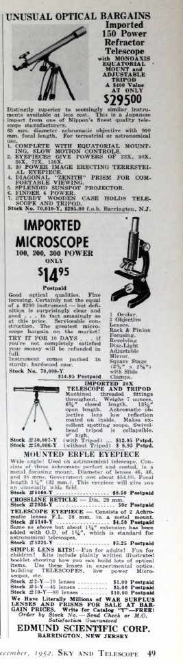 みなさま、こんにちわ。 ガラクマ様のNo.11561にあるUNITED TRAEING CO.広告ですが、これは日本精光研究所です。 この時期、UNITED TRAEING CO.が、日本精光研究所の製品を一手に取り扱っていた? 日本精光研究所がユニトロン・ブランドで輸出するまでは、ポラレックス・ブランドと考 えますが、どうなんでしょうか。 小島氏も、小林栄道氏の日本精光研究所の海外輸出を見ていたでしょうし、両者を比較し ながら、国産天体望遠鏡史を考えてみるのも面白いと思っています。 国内の広告と海外の広告の比較も楽しいです。 ロッド様が、見つけてくれました川村氏のトリプレーンの解説、掲載ありがとうございま す。ネットでTP-6mmを分解した記載がありますが、気になるのは、レンズの大きさです。 本来は眼レンズ、もっと大きです。 この辺は、出版の関係なのでしょうか、と思ってしまいます。