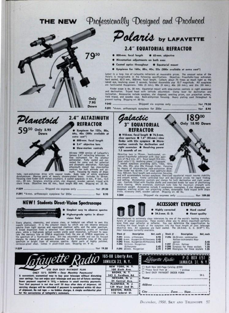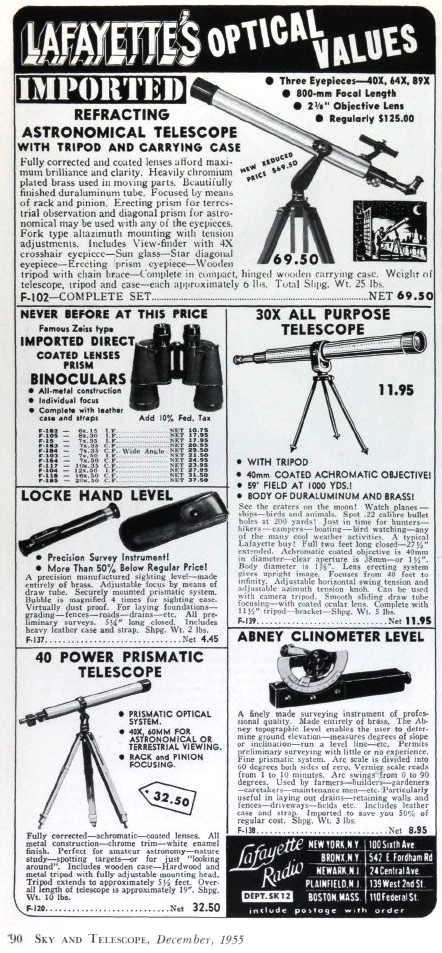 青色つきこ様 ロッド様 ガラクマ様 皆様 いつも貴重な資料の紹介、ありがとうございます。 その「検査年報」昭和30年度の天体望遠鏡の輸出台数が539台というのは貴重かつリアルなデータです。 (スポッティングスコープを除いた純粋な天体望遠鏡のデータは本当に貴重です!) 1955年ですから、そのうちの過半が日本精光の台数と思いますが、 30台/月でも360台になりますし、4センチの最廉価版でも1台とカウントしているでしょうから、ビジネス的にはまだまだ伸びしろがある感じです。 ガラクマさんが提示された広告に、“驚くほど安い”と書いてあるのが印象的ですが、 以前私もユニトロンの米国カタログの値段を見たとき、安いナ〜と思いました。 しかし、$=360円として当時の日本の諸物価と比較すると、決してダンピングではなく、むしろ高額な感じです。 天体望遠鏡の広告もハッタリというか、微妙なニュアンスの誇大広告が散見されますネ。 ダウエルのオリオン望遠鏡の販売台数ほどではないにせよ、ロッド様のように純朴な方が引っ掛ってしまうような表現は良くないですね〜 ロッド様が提示されたアストロ光学工業の広告文の「輸出の80%が当社の製品」というのもどうなんでしょうかね〜 そのズラっと望遠鏡を並べた写真を使ったり、少し誇大気味な文面を使うのも、小島氏の“手法”ですね。 製品だけでなく、そういうソフト的なところまで後世に影響を残されたなんて。。。