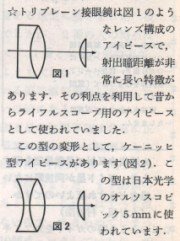 みなさま様、こんばんわ。 望遠鏡を並べて大量輸出をアピールするのは、日本精光研究所がより早いですよ。 1953年11月の「月刊教材教具」に載った広告です。 日本精光は、輸出に重きを置いていたようで、国内向けは二の次、三の次です。 日本精光はユナイテッド・トレーディング・カンパニーに望遠鏡の優秀性を認め られて、ユナイテッド・トレーディング・カンパニーが一手に取り扱いしたよう です。このころは、ポラレックスです。 国内向けにより安価に提供しだしたのは、やはり小島氏のアストロ光学です。 やっぱり、気になるトリプレーンですが、吉田正太郎氏の「光学機器大全」に 載っている照準器のアイピースは、ケーニヒのハイ・アイです。 ライフルスコープなどの1940〜60年代のUSパテントを見ると、ケーニヒのハイ ・アイのアイピースが基本になっています。ライフルスコープもこの時期、 大量に輸出されており、それが、アストロ光学からトリプレーンの名称で販売 されたのだと思います。なんで、トリプレーンという名前をつけたのでしょうか。 トリ=三枚、プレーン=平原、平坦 3枚レンズで平坦なアイピース 鳥打ちに使うライフルの照準器だから、鳥打ち遊び・競技でとり・プレー・ん やっぱり気になります。