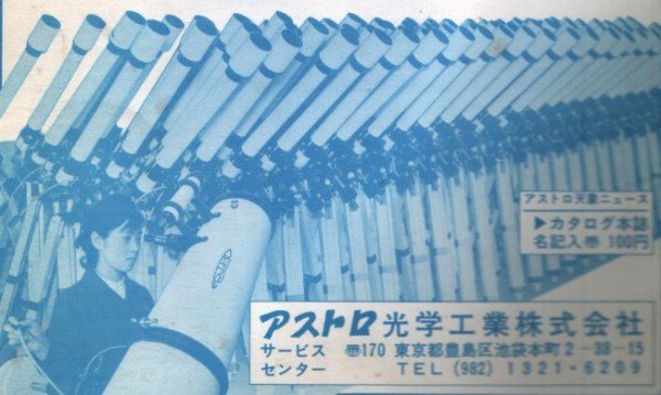 エド様、私も同感です。 大量に輸出しているとか、大量に売れているとかいう広告を見て、「それじゃ、ボクも真似して買おう」 そんな事思う人がどれだけいたでしょうか? 私はアストロ光学の広告には少々違和感を感じます。 高橋や五藤のような質実剛健、地味なカタいイメージのほうがむしろ売れたんじゃないか?と思うんです。 ソフト路線でアストロのお姉ちゃんや子供たちを出演させて大衆路線を狙ったのは、販売上はマイナスだったように思います。 つまり、アストロの製品を実際に使ってみると、きわめて丁寧に真面目に作られた物で、フィーリングとしては高橋に近い物なんです。 80年代以降のアストロは小島氏の遺産が薄れて品質低下したのか? と思いきや、私が買ったLN赤道儀(KONUS POLER SYSTEMという特別仕様?です)は驚いた事に500mmほぼノータッチガイドできそうなほどの追尾精度です! 私は高橋も何台か持っていますが、アストロのほうが軽便で使いやすいのでいつも愛用しています。 宣伝のしかた次第ではもっともっと売れたはずです。