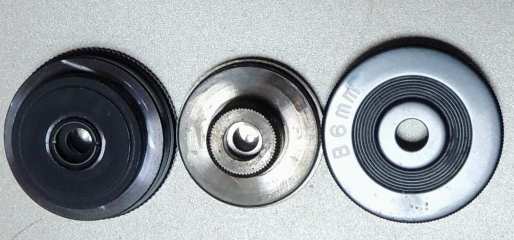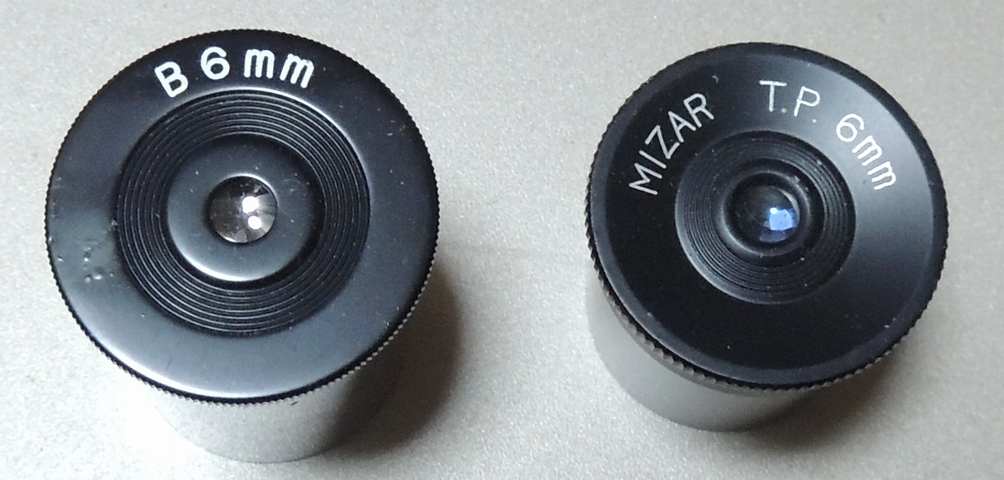 TPですが、手元のペンタックスB6もTP構成です。分解すると目側はカシメで固定されていましたが単レンズ、もう一方が貼り合わせです。レンズ径はB6が若干小さく、反射像を見る限り曲率はミザールと異なるようです。目側の空気面の反射は近いのですが、貼り合わせ〜内側面の反射像の大きさが違って見えますが、微妙です。作りはミザール=タカハシ=3Bと、ペンタは異なります。材質も真鍮で、カシメも使っているので部品工場は違いそうです。
